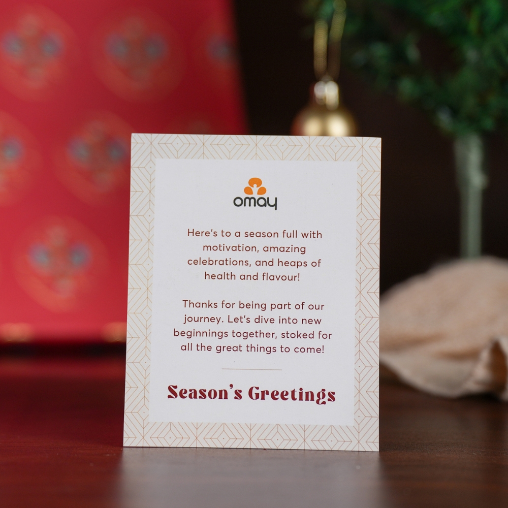 Make New Years & Christmas the most joyous, flavorful, and special with this limited-edition Omay Foods Gift Box. Featuring a assortment of healthy roasted snacks, chocolates, and pocket diary to create a warm and cheerful holiday experience. Perfect for both corporate and personal gifting.