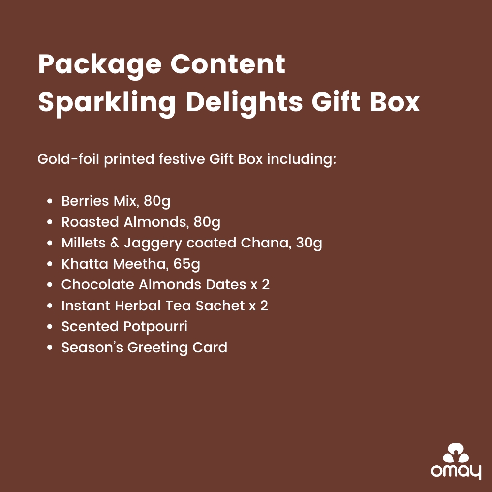 Includes: Berries Mix, 80g, Roasted Almonds Classic Salted, 80g, Millets & Chana Jaggery coated, 30g, Khatta Meetha Mix, 65g, Chocolate Almonds Dates x 2, Oh Cha! Tea Instant Tea Sachet x 2, Scented Potpourri, Greeting Card & gold-foiled gift box packing