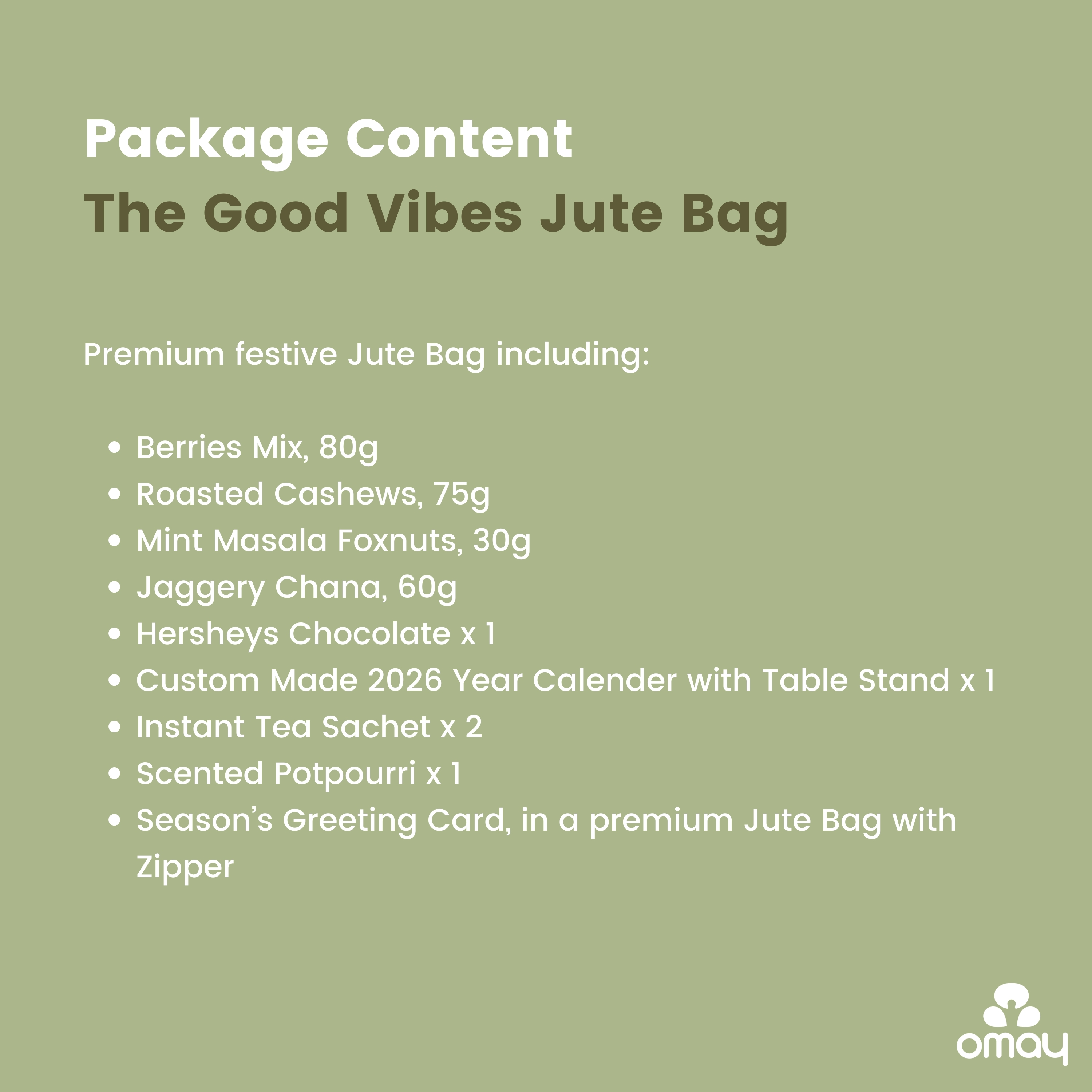 Includes: Berries Mix, 80g, Roasted Cashews Classic Salted, 75g, Mint Masala Foxnuts, 30g, Millets & Chana Jaggery Coated, 60g, Hersheys Chocolate x 1, Custom Made 2026 Year Calender with Table Stand x 1, Instant Tea Sachet x 2, Scented Potpourri x 1, Season's Greeting Card in a premium Jute Bag with Zipper