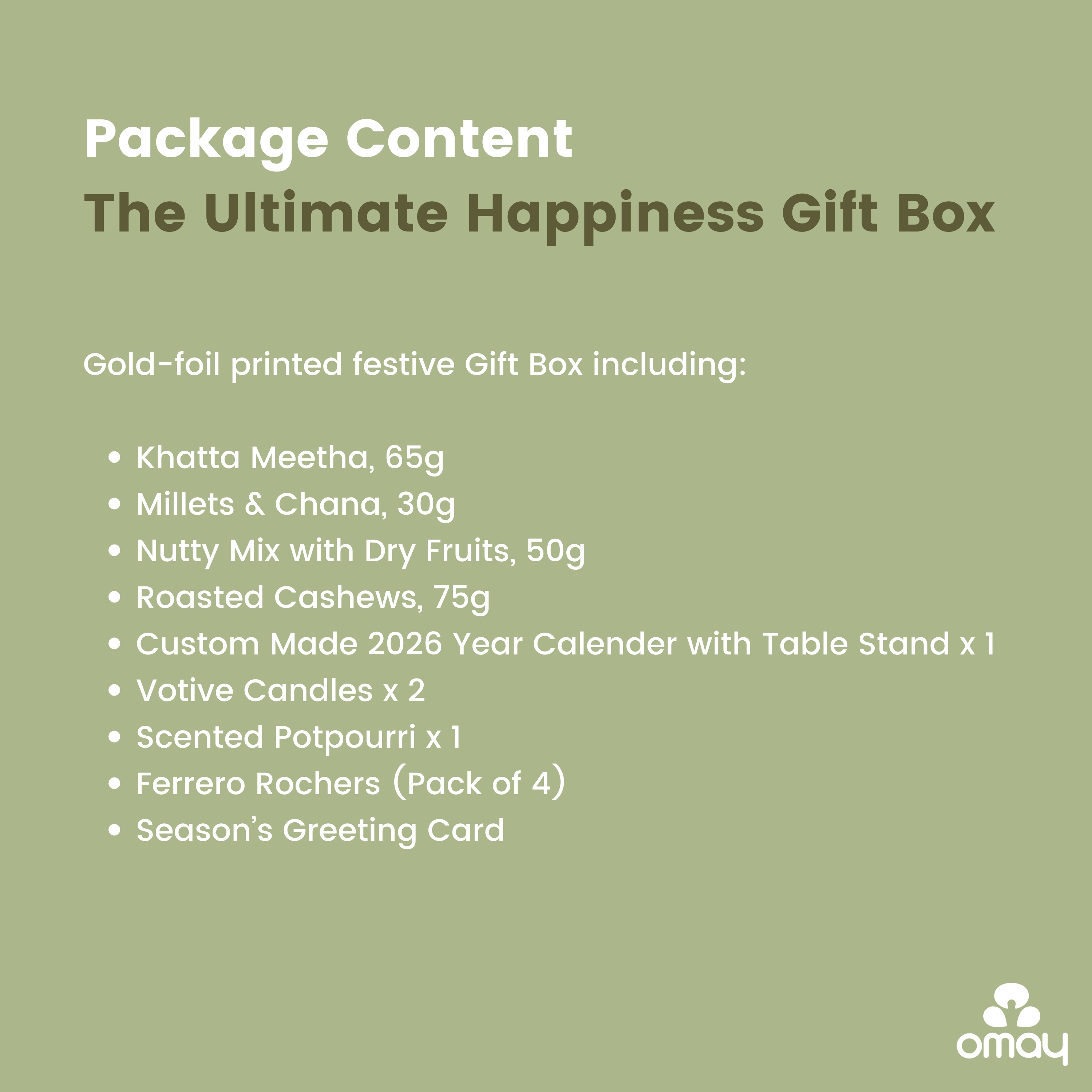 Includes: Khatta Meetha Mix, 65g, Millets & Chana Jaggery Coated, 30g, Nutty Mix with Dry Fruits, 50g, Roasted Cashews - Classic Salted, 75g, Custom Made 2026 Year Calender with Table Stand x 1, Votive Candles x 2, Scented Potpourri x 1, Ferrero Roacher (Pack of 4), Season's Greeting Card in a Gold-foiled gift box packing