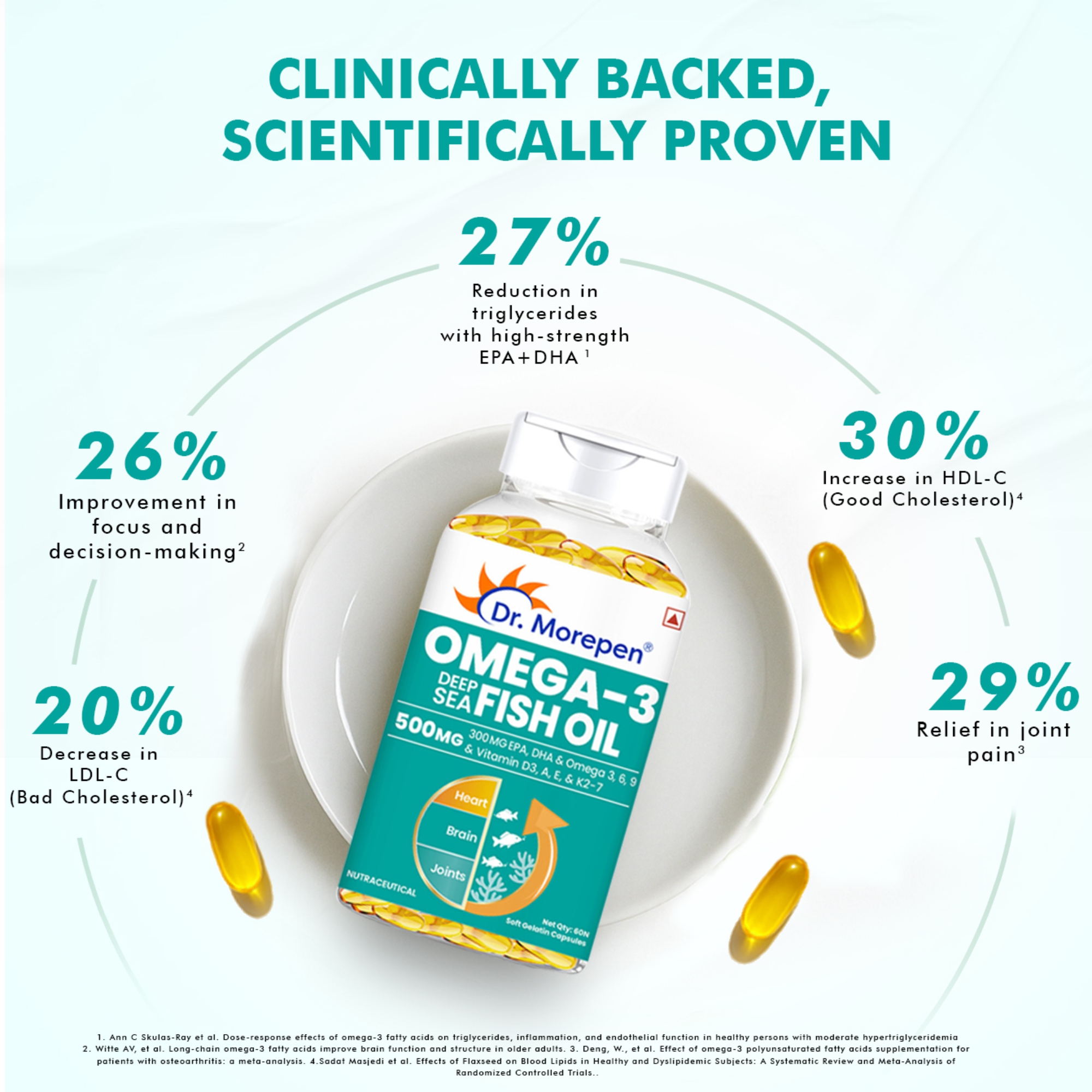 Dr. Morepen brings to you, the richness of Omega-3 derived from purest source of nature backed by science in the form of OMEGA-3 Deep Sea Fish Oil Capsules. This is produced from Ultrapure Micro-filtered Deep Sea Peruvian Anchovy Fish. It has been cold-pressed, molecularly distilled and micro filtered to provide a rich dose of 500mg Fish Oil to ensure the best quality Omega-3 with 180mg EPA & 120mg DHA in each softgel capsule. WHY DO WE NEED OMEGA-3? Omega-3 fatty acids (EPA & DHA) are one of the most essential nutrients that we need to manage & reduce the risk of heart diseases. Also, it has various health benefits for sound Brain & Joints Functioning. Our bodies may not produce it on their own, but it can be derived from our diets. Researchers say, a normal Indian diet lacks the average amount of Omega-3 needed per day which brings us closer to heart & lifestyle diseases each day. Thats when our fish oil capsule comes to the rescue, if youre not having cold water fish, 3 times a week in your food. Dr. Morepens Pure & Deep Sea Fish Oil Capsules are considerably more effective in keeping triglycerides under check, brain sharp & joints stronger with 500mg Fish Oil enriched with 120mg DHA + 180mg EPA along with Vitamins- A, D, E & K2 per capsule.
