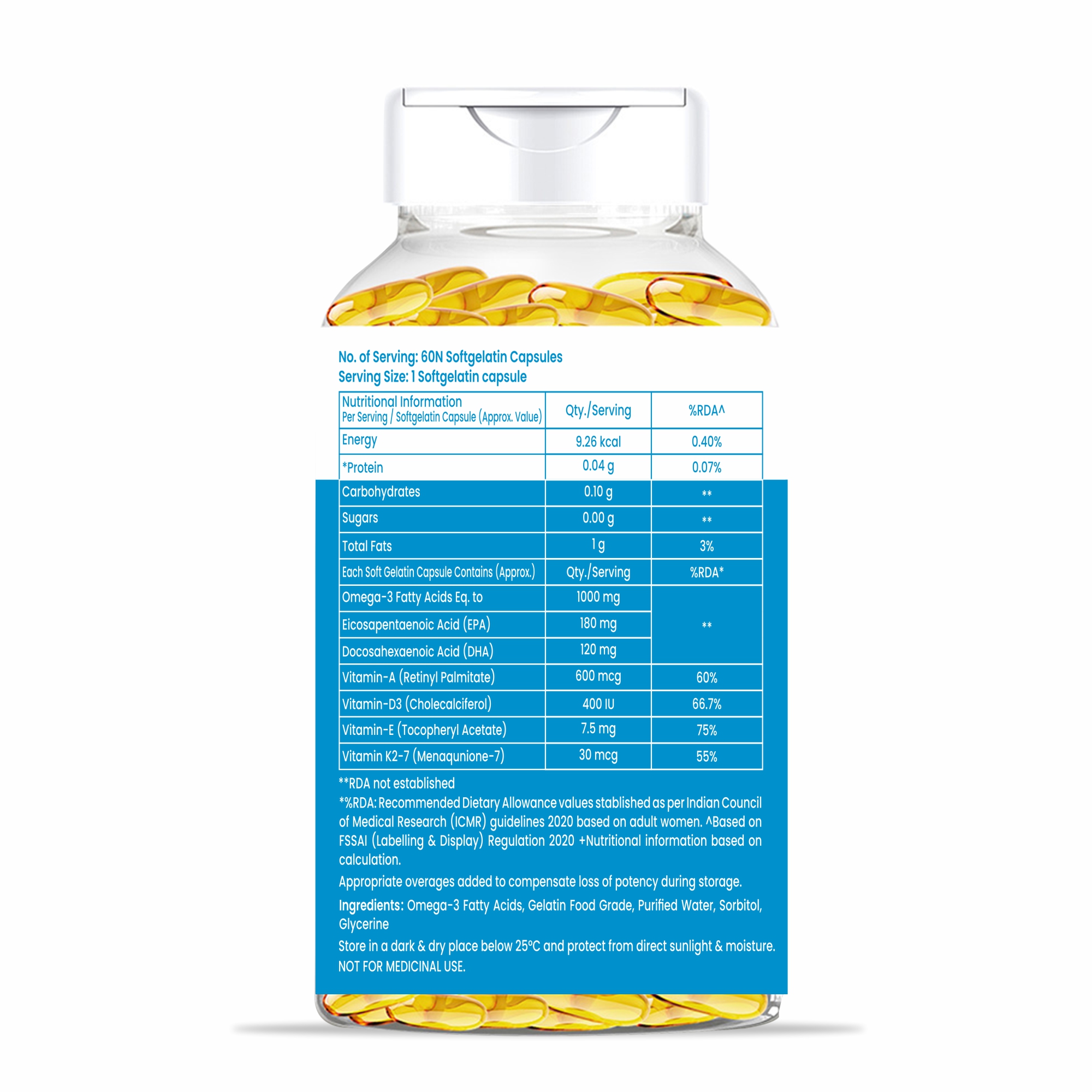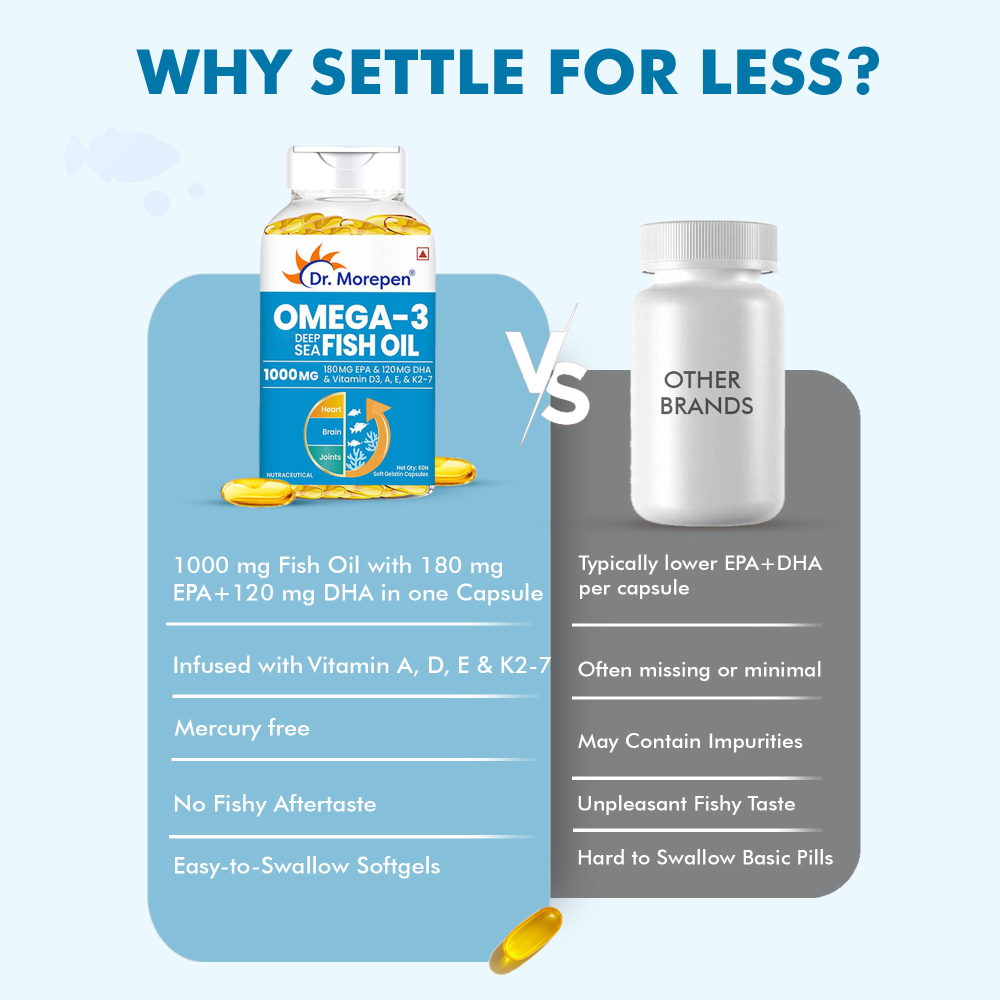 Dr. Morepen introduces Deep Sea Omega-3 fish oil supplements for improved heart health, cognition, & stronger bones. Our Omega-3 fish oil soft gels come enriched with essential fatty acids such as Eicosapentaenoic acid (EPA) & Docosahexaenoic acid (DHA) our bodies need to stay in good health & function well. Though our bodies produce these polyunsaturated fats in small amounts; we need to get plenty of them either through diet or supplements for overall wellness. Our Deep Sea Omega-3 capsules come brimming with ultra-pure & microfiltered Omega-3 fish oil derived from Deep Sea Peruvian Anchovies. Each of these soft gel capsules contains 180 mg of EPA & 120 mg of DHA alongside vitamins A, D, and E to replenish your body for improved heart, brain, & bone health. Powerful Omega-3 fatty acids in our supplement diligently work to promote heart health by reducing the levels of bad cholesterol & triglycerides. Besides, key nutrients in this fish oil supplement improve blood circulation & regulate blood pressure for better heart functions. Around 60% of the human brain is made of fats & most of them are Omega-3 fats. Therefore, getting plenty of Omega-3 fats (EPA & DHA) is crucial for the regulation of brain functions.