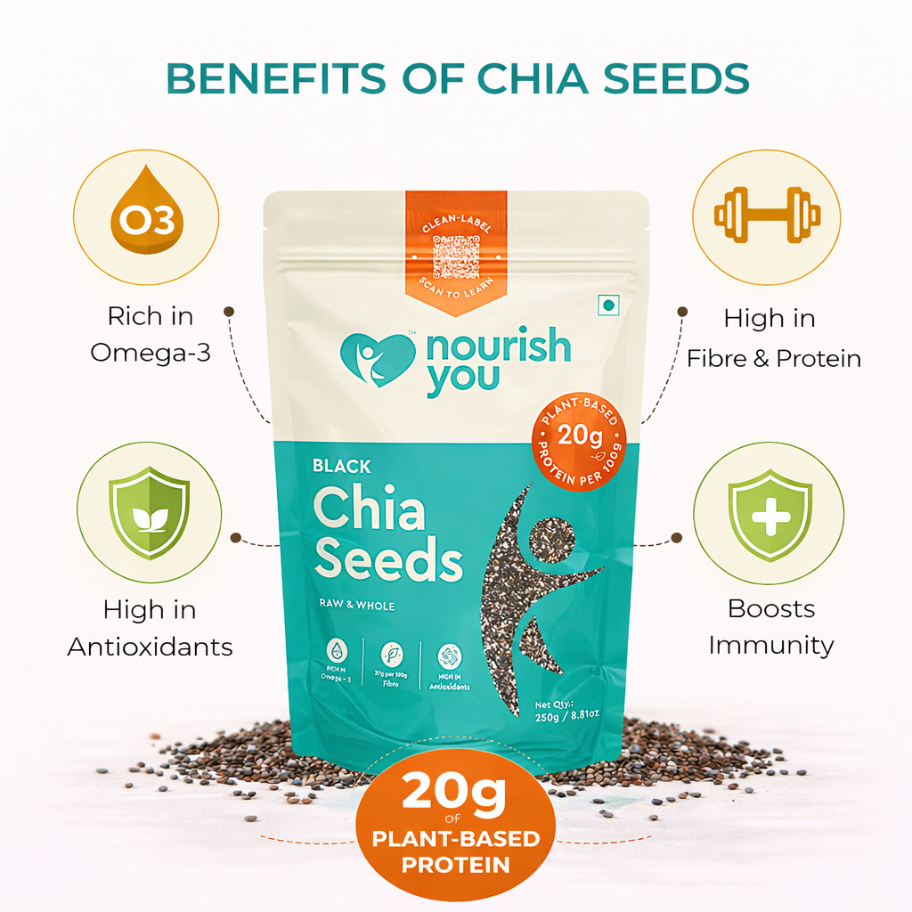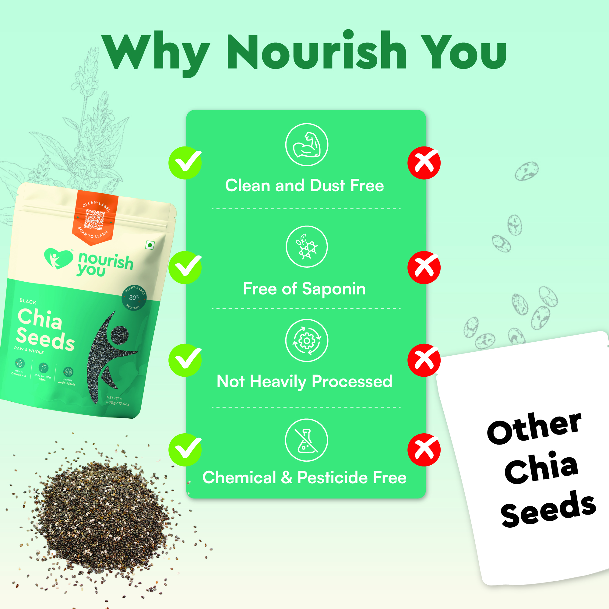 Discover the unparalleled nutritional benefits of Nourish You's Organic Raw Black Chia Seeds, a powerhouse of wellness in every tiny package. Sourced from pristine organic farms, these seeds are cultivated with utmost care to deliver a premium product that elevates your health and taste experience.Packed with omega-3 fatty acids, fiber, and essential minerals, our chia seeds are a versatile addition to your daily diet. The deep black hue signifies their richness in antioxidants, ensuring you receive the maximum health benefits with each serving. These seeds are carefully harvested in their purest form, untouched by any artificial additives or pesticides, maintaining the integrity of their nutritional profile.Nourish You's Organic Raw Black Chia Seeds are a convenient and adaptable superfood. Sprinkle them over your morning yogurt, blend them into smoothies, or incorporate them into your baking recipes for an added nutritional punch. With a subtle, nutty flavor, these chia seeds seamlessly enhance the taste of your dishes while promoting overall well-being.Elevate your nutrition with Nourish You's Organic Raw Black Chia Seeds a testament to purity, quality, and the commitment to your holistic health journey.