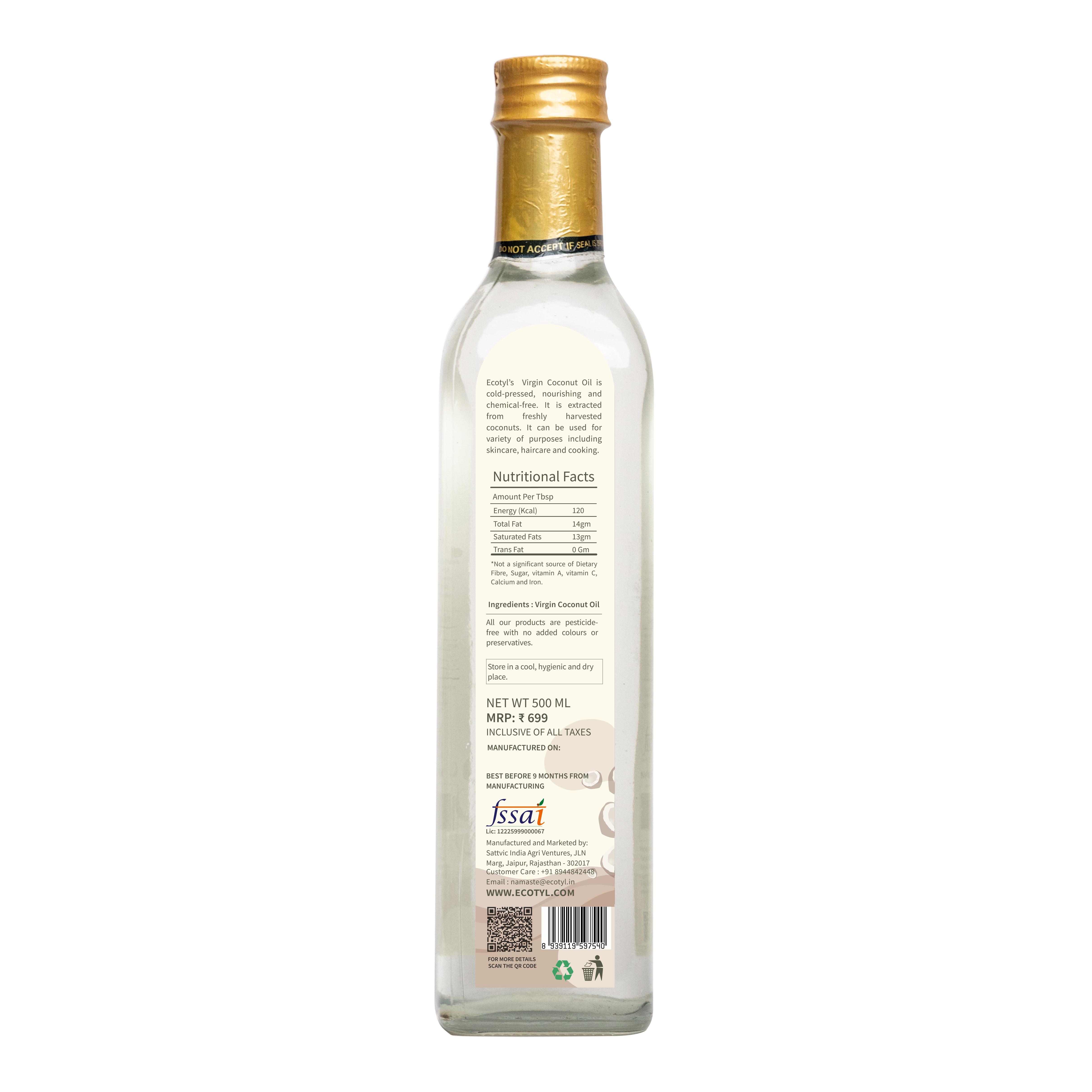 Ecotyls Virgin Coconut Oil is prepared by cold- pressing fresh coconuts. This means that the oil is unrefined, and its extracted without application of heat. This helps in retaining its nutritive properties. It has no harmful chemicals in it which are generally added to oils. Its considered an excellent cooking oil for food preparations that require medium heat sauteing and baking. Virgin coconut oil is considered an ideal carrier oil like many essential oils that have several health and skin applications.