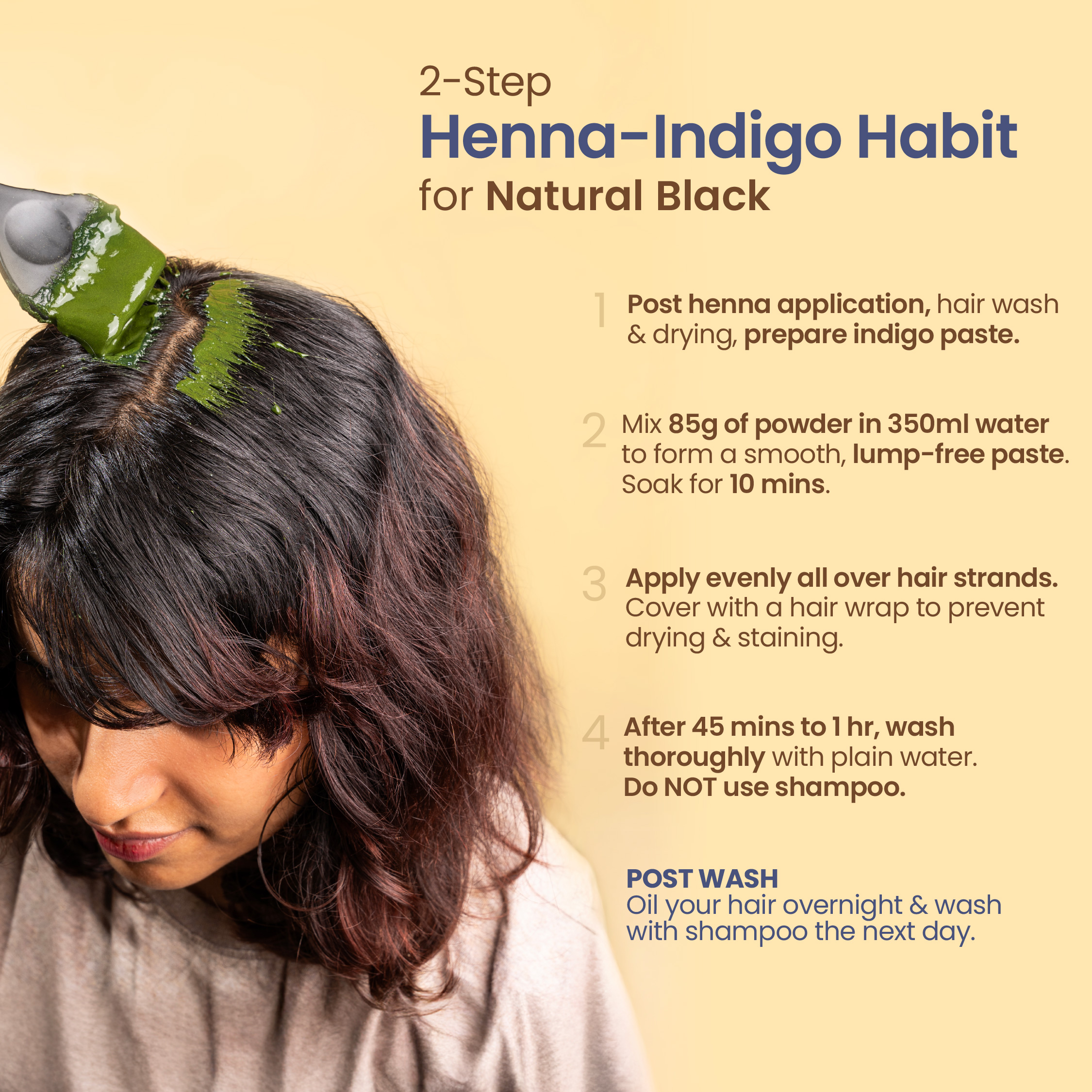 After henna application, hair wash and drying, prepare indigo paste. Do not applyoil between henna and indigo applications.