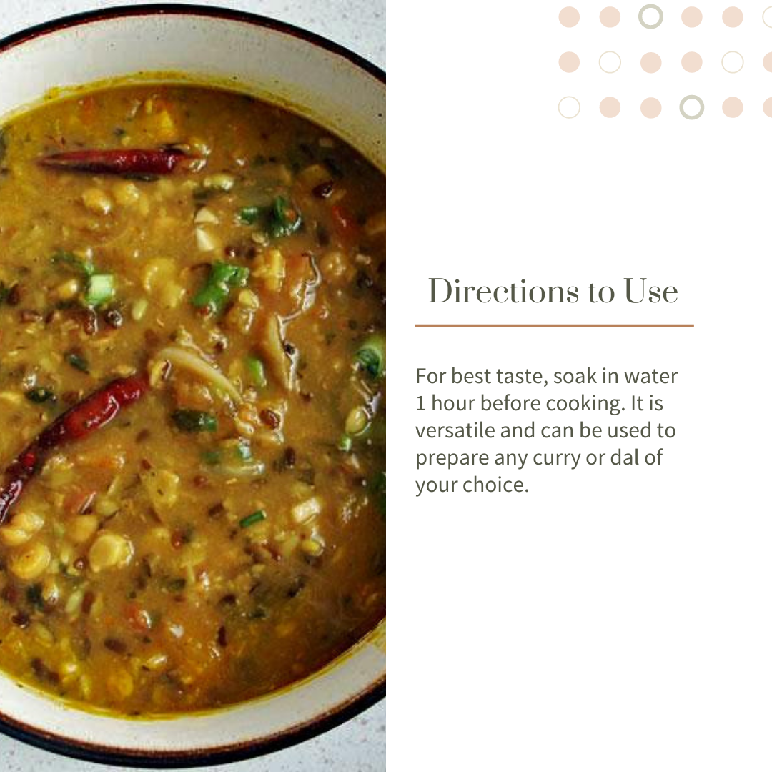 For best taste, soak in water 1 hour before cooking. It is versatile and can be used to prepare any curry or dal of your choice.