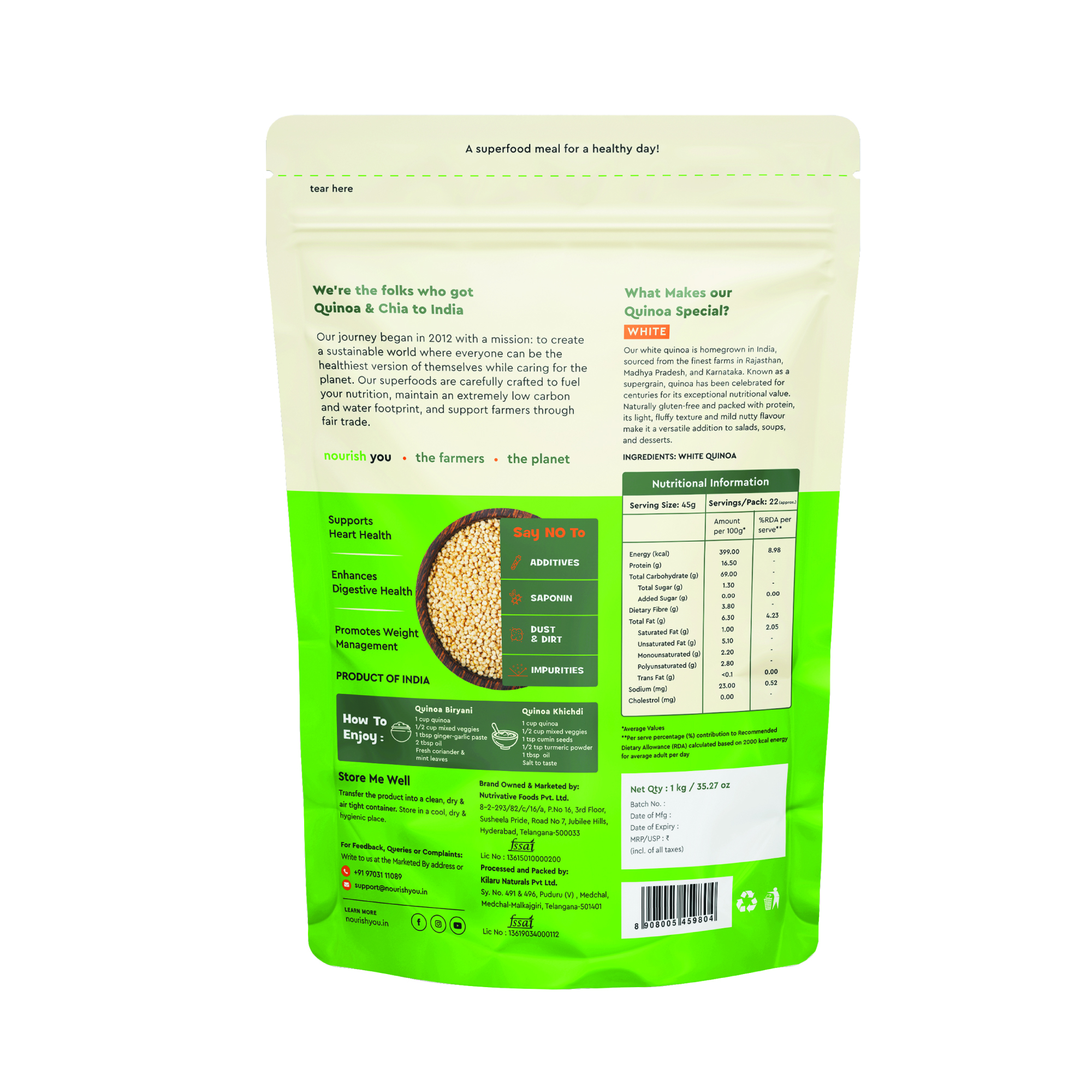 Introducing Nourish You Organic Raw White Quinoa the epitome of wholesome nutrition for the mindful consumer. Sourced from the finest organic farms, this gluten-free, raw vegan superfood is a culinary treasure that elevates your health-conscious journey.Packed with micro-nutrients, proteins, and essential nutrients, our Raw White Quinoa is a versatile addition to your daily regimen. Cultivated to perfection, it seamlessly integrates into a healthy diet and enhances your culinary experience with its nutty flavor and delicate texture.This nutritional powerhouse is rich in Omega-3 fatty acids, promoting heart health and overall well-being. Elevate your calcium and magnesium intake naturally with each serving, supporting bone strength and muscle function. Whether you're a seasoned chef or a home cook, our Raw White Quinoa is your trusted companion in crafting nourishing meals.Prioritize your health with this premium quinoa, meticulously processed to retain its raw goodness. Ideal for salads, bowls, and a variety of culinary creations, it's the perfect foundation for a wholesome lifestyle. Embrace the benefits of organic, gluten-free living choose Nourish You Organic Raw White Quinoa for a delightful fusion of taste and well-being.