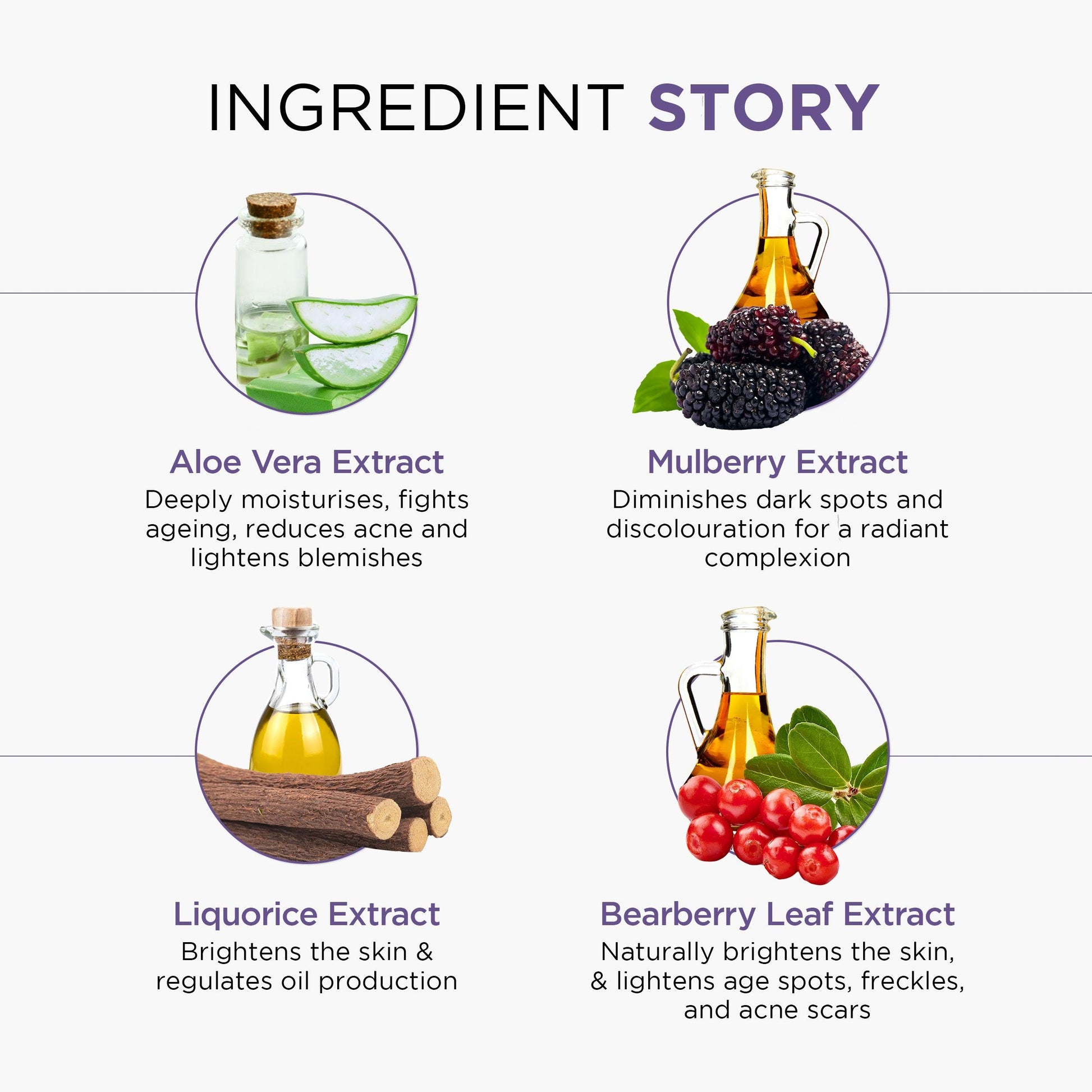 - Aloe Vera Extract, Mulberry Extract, Liquorice Extract