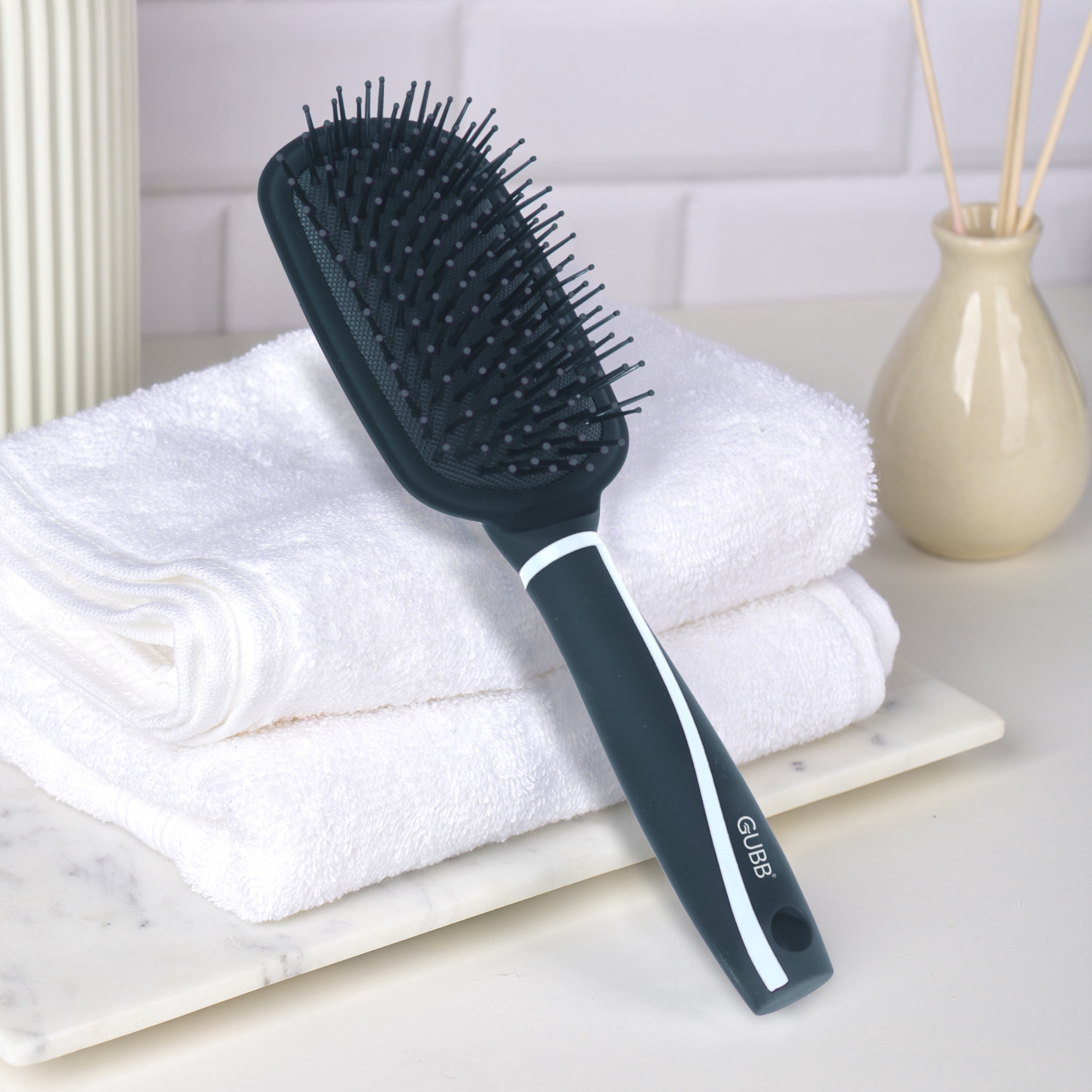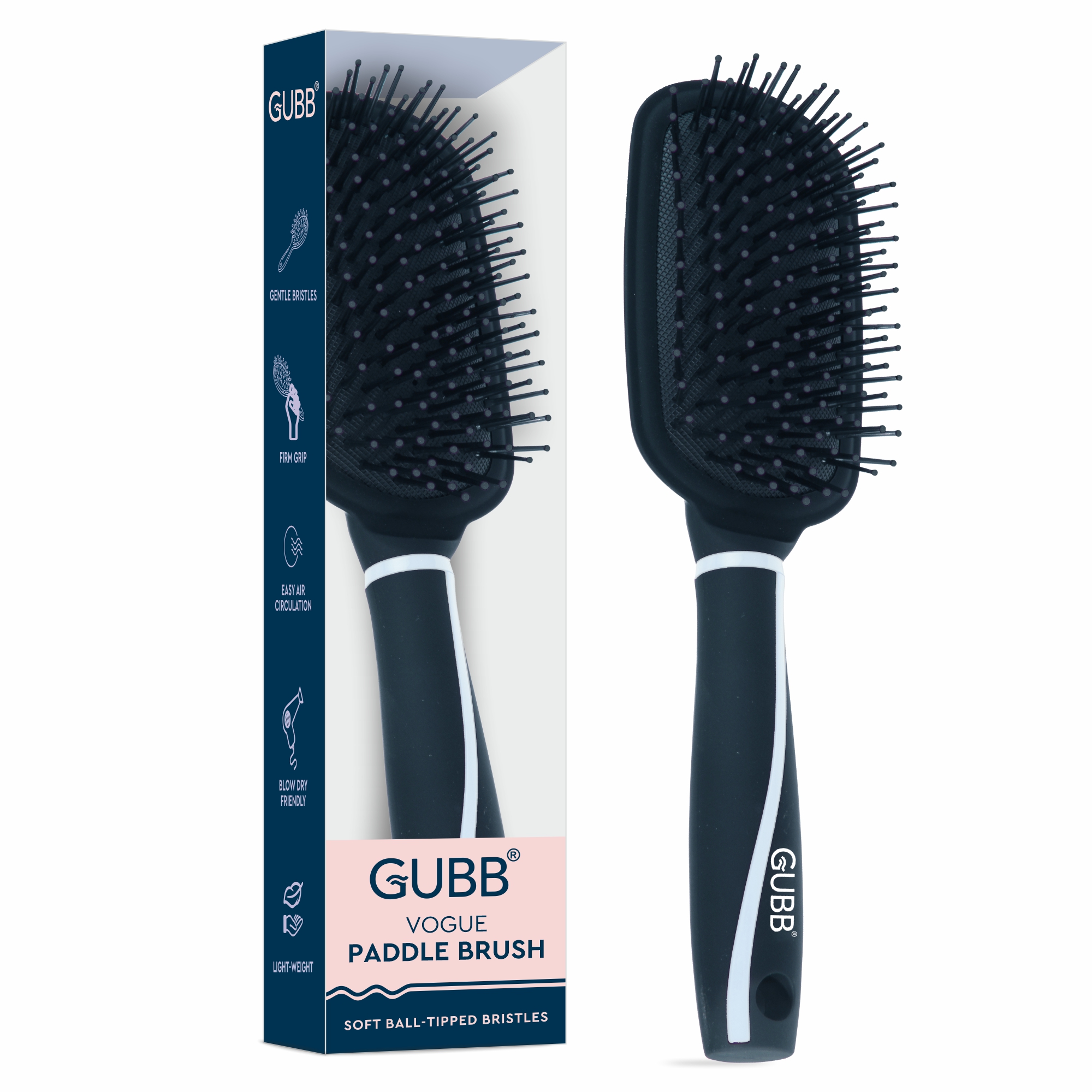 GUBB Paddle Hair Brush helps smoothen and polish tresses of all length with ease & comfort. This large, rectangular paddle brush bends to the contours of your scalp, with ball-tipped nylon bristles designed to massage. The brush's design prevents unwanted static, and evenly distributes your natural hair oils from root to tip.