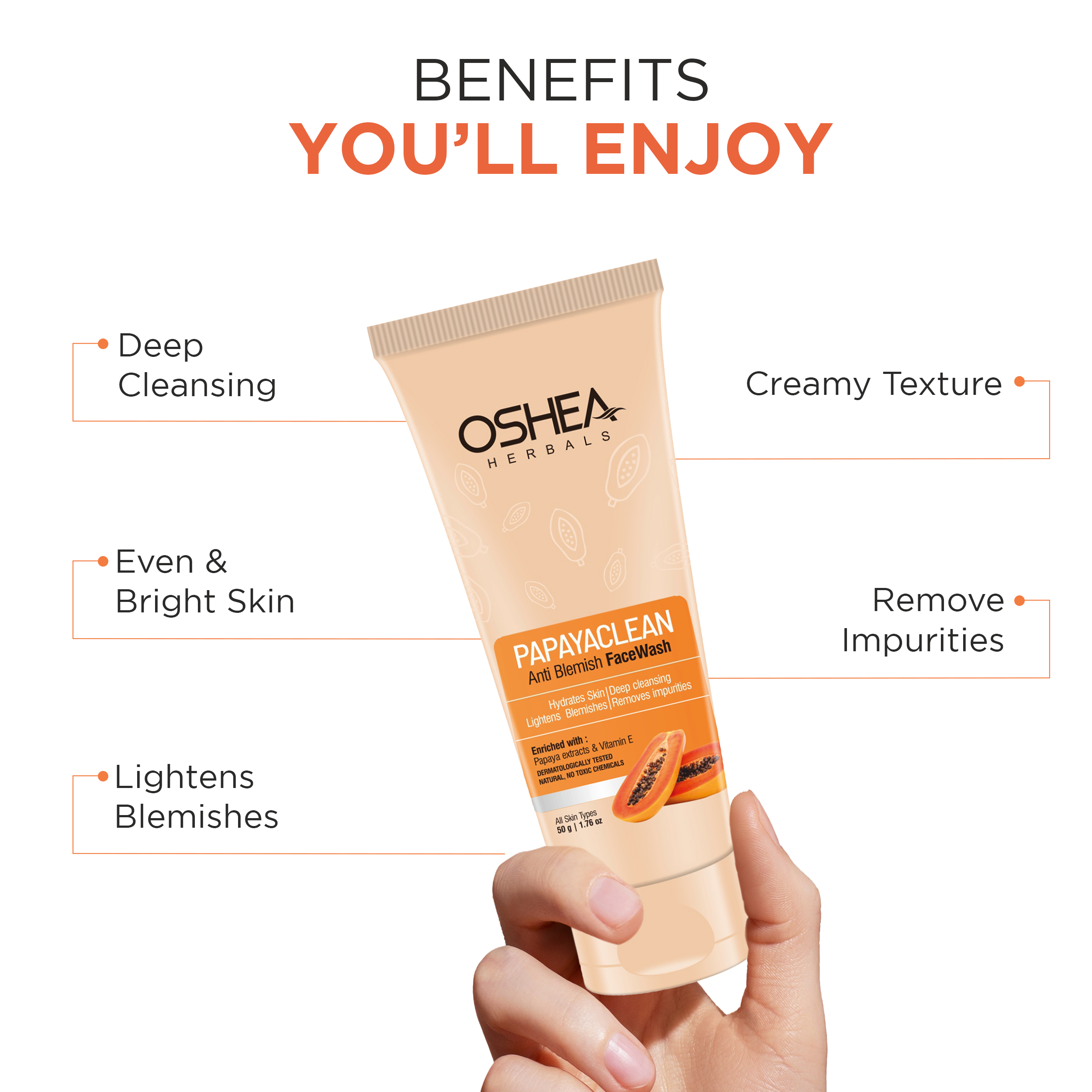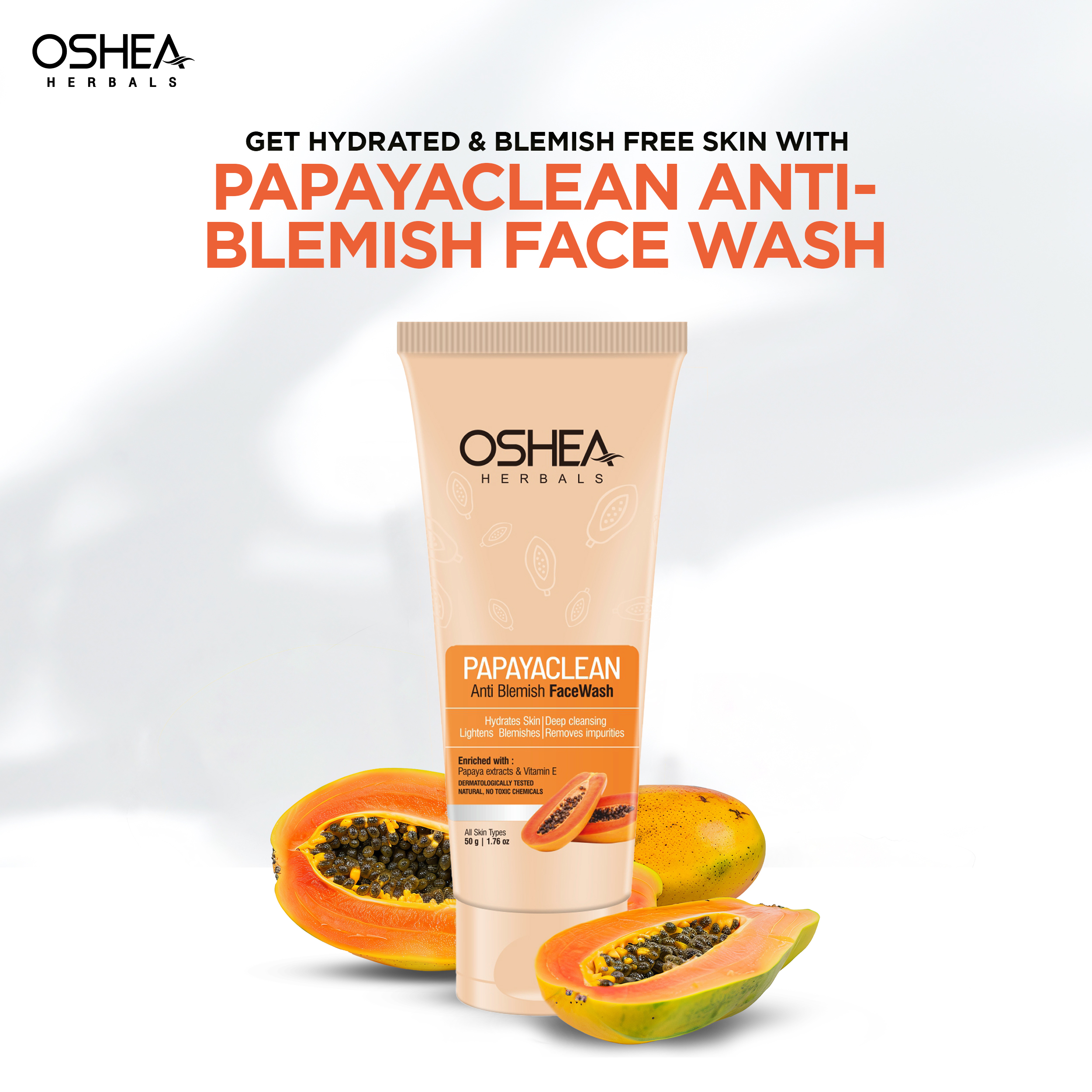 A unique face wash developed scientifically using papaya extract with natural vitamin E, which deep cleanses the skin, lightens the blemishes & removes impurities from the skin, leaving it refreshed. A unique & best papaya face wash from Oshea Herbals, suitable for oily skin, pigmented skin & all skin types. Find out how to use papaya face wash on your skin & benefits of papaya for skin. The papaya face wash can be used by anyone who wants hydrated skin with a natural glow. This natural papaya facewash is developed clinically using healthy ingredients that make it suitable for everyday use. Unlike regular face washes, this does not make your face dry. You can use it twice every day while doing your regular skincare routine. It's suitable for both men and women.