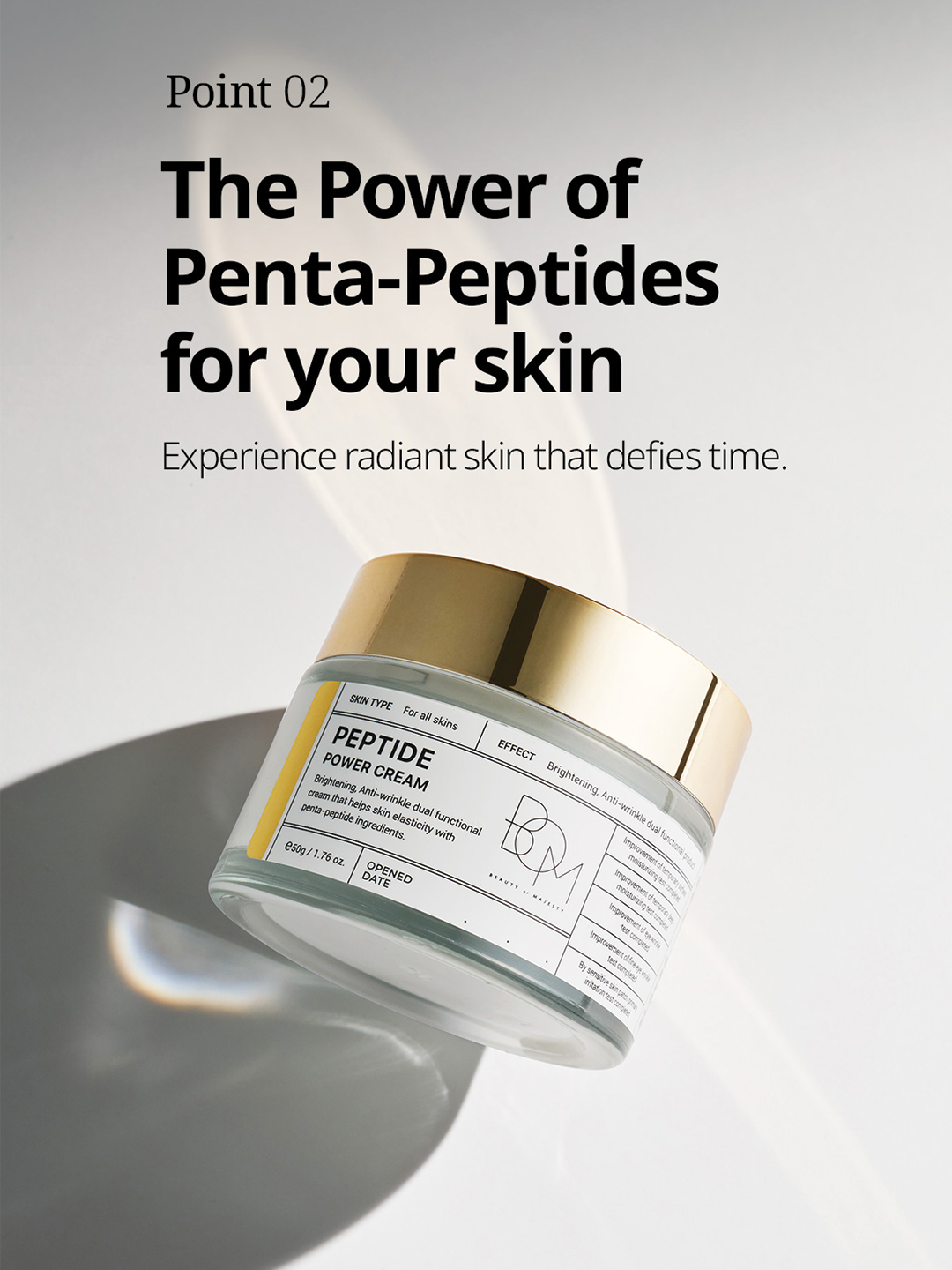 PEPTIDE POWER CREAM is formulated to deeply hydrate, firm, and revitalize the skin. Infused with peptides, it helps enhance skin elasticity, reduce the appearance of fine lines, and support a smooth, youthful complexion. Its rich yet non-greasy texture absorbs easily, providing long-lasting moisture while strengthening the skins natural barrier. Ideal for daily use, this cream leaves your skin soft, supple, and radiant, promoting a healthier and more resilient appearance.