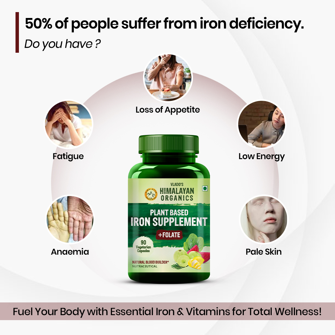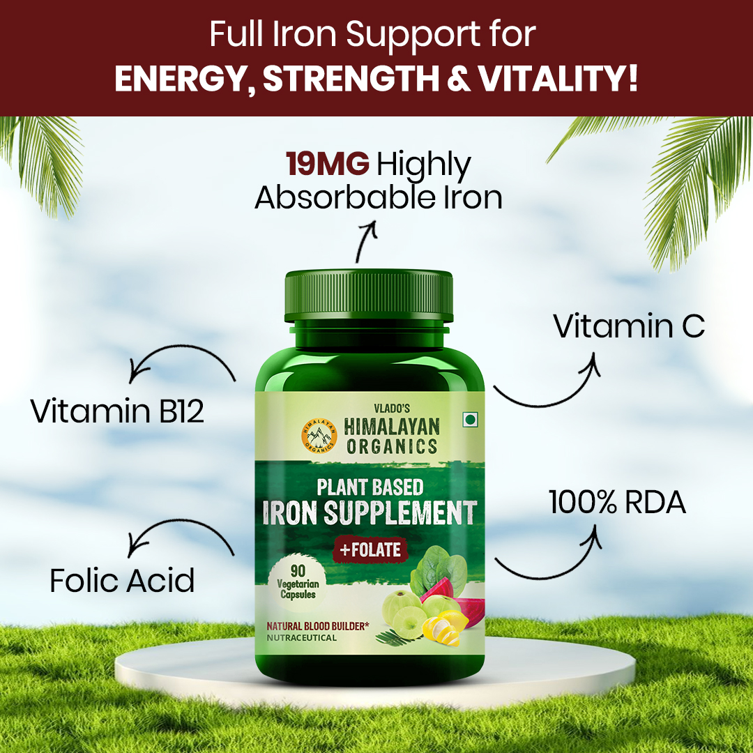 Increase iron levels and manage fatigue with Himalayan Organics Iron Supplements. It contains 120 vegan and gluten-free capsules made with highly potent plant extracts like Spinach, Beet Root, Parsley, Prickly Pear, Dragon Fruit, and Thyme Leaves for healthy cognitive functioning, stronger immunity, and smooth iron absorption. Himalayan Organics Plant-Based Iron Supplement is a hemoglobin booster that boosts iron levels and relieves fatigue. Made with nourishing whole foods extracted from lush green farms like Spinach, Parsley, BeetRoot, Prickly pear, Thyme, and Dragon Fruit, these capsules ensure healthy red blood cell production, supports cognitive functioning, boosts energy levels, discourages tiredness, and strengthens immunity. It is an all enriching and nourishing formula that is gentle on the stomach and ensures a healthy self!