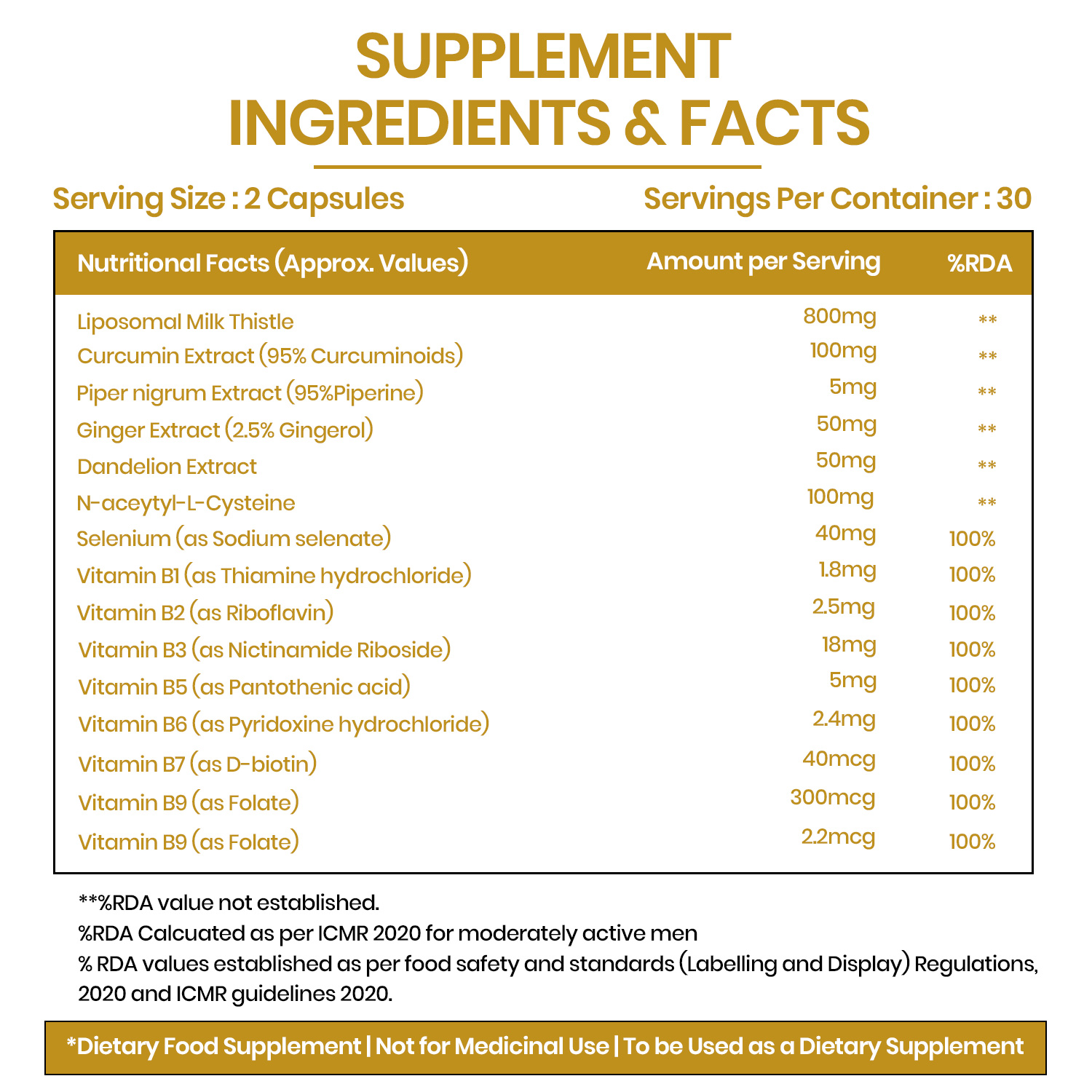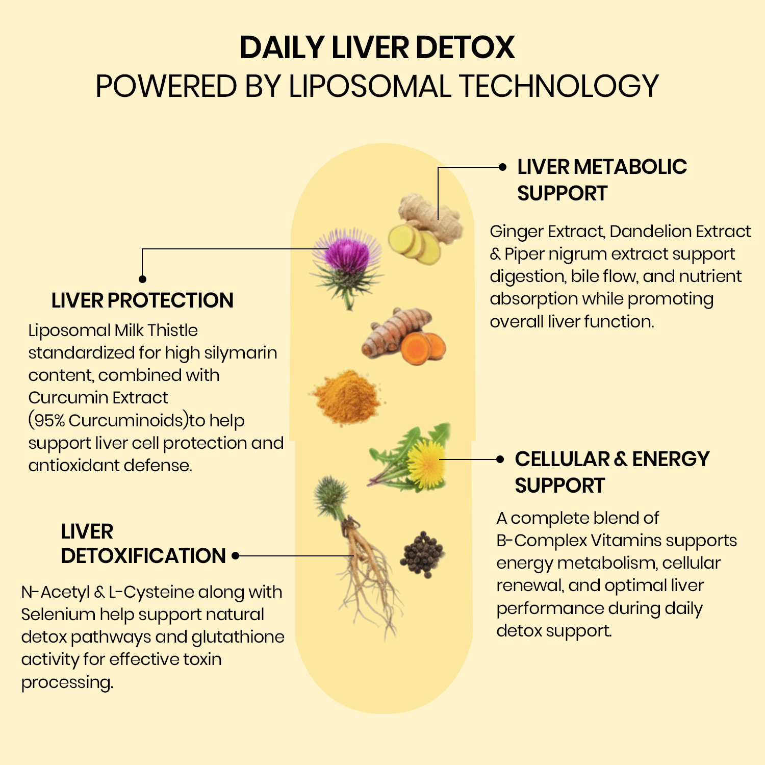 Liposomal Milk Thistle, Curcumin Extract, Piper nigrum Extract (Piperine), Ginger Extract, Dandelion Extract, N-Acetyl-L-Cysteine, Selenium, Vitamin B1, Vitamin B2, Vitamin B3, Vitamin B5, Vitamin B6, Vitamin B7 (Biotin), Vitamin B9 (Folate)