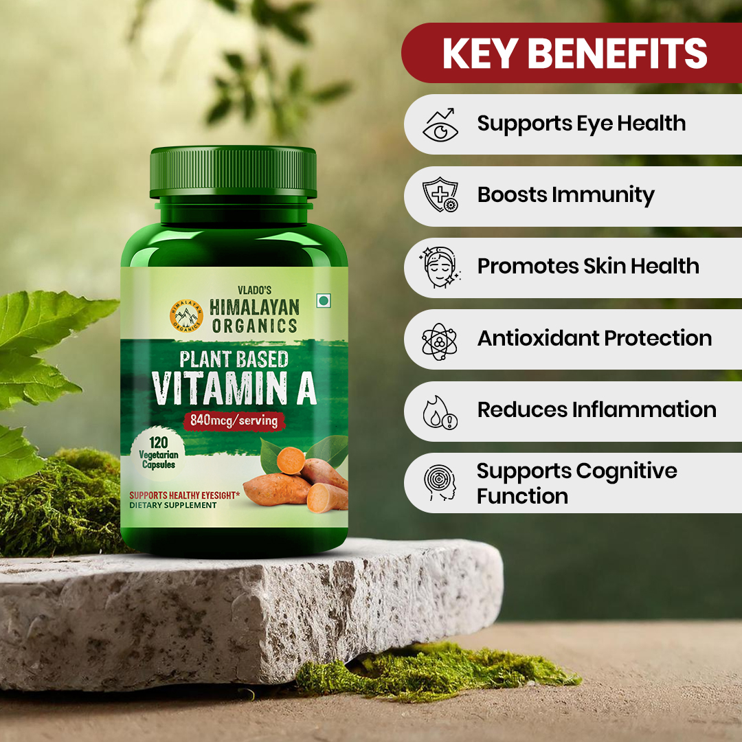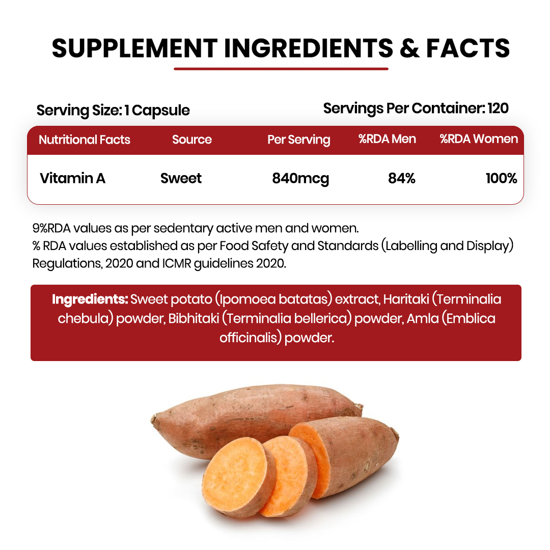 Get ready to build a healthy body with Himalayan Organics Plant Based Vitamin A. An all-rounder formula made with Sweet Potato & Triphala to provide you plant-derived vitamin A without any preservatives or chemicals. Vitamin A is an essential fat-soluble vitamin that your body needs for vision, cognition, reproduction, brain, skin, cell development & much more. Hence, you cannot afford to be deficient in this vital vitamin. This expert-approved and easy-to-digest formula will naturally fill your body with daily Vitamin A requirements. Be Adorable with Vitamin A!