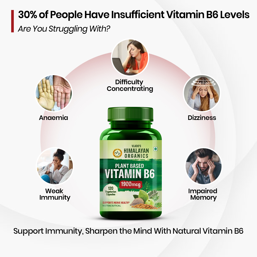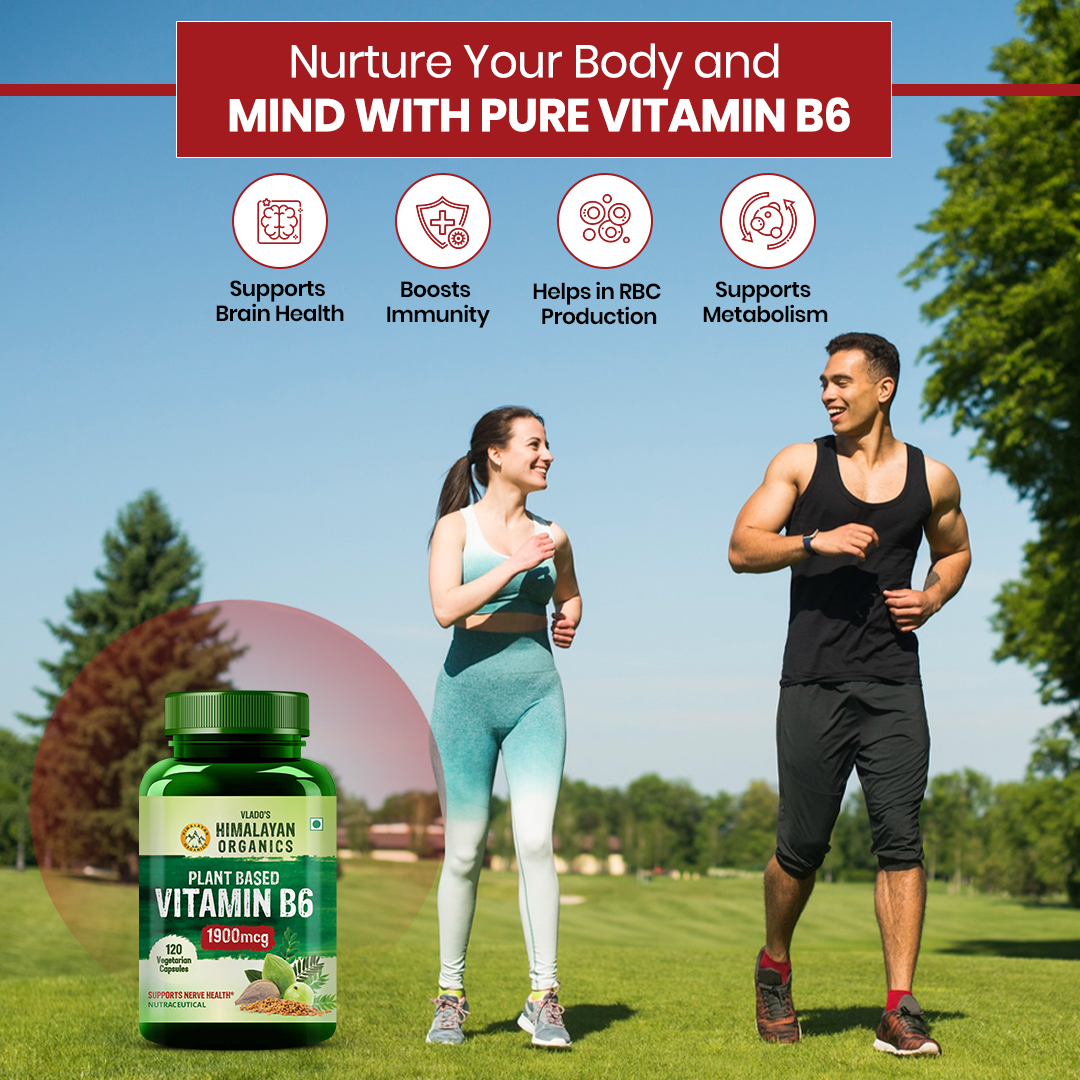 Do you know your brain health, immune functions and even haemoglobin levels are all associated with one single vitamin? Vitamin B6! Being a water-soluble vitamin, Vitamin B6 cannot be produced in your body, thus, you need to supplement it to fulfil your daily RDA. Himalayan Organics Vitamin B6 is a plant-based, expert-approved formula with 13 highly potent natural extracts for different functions in your body.Taking Vitamin B6 daily supports a healthy nervous system, heart, and a normal energy metabolism.