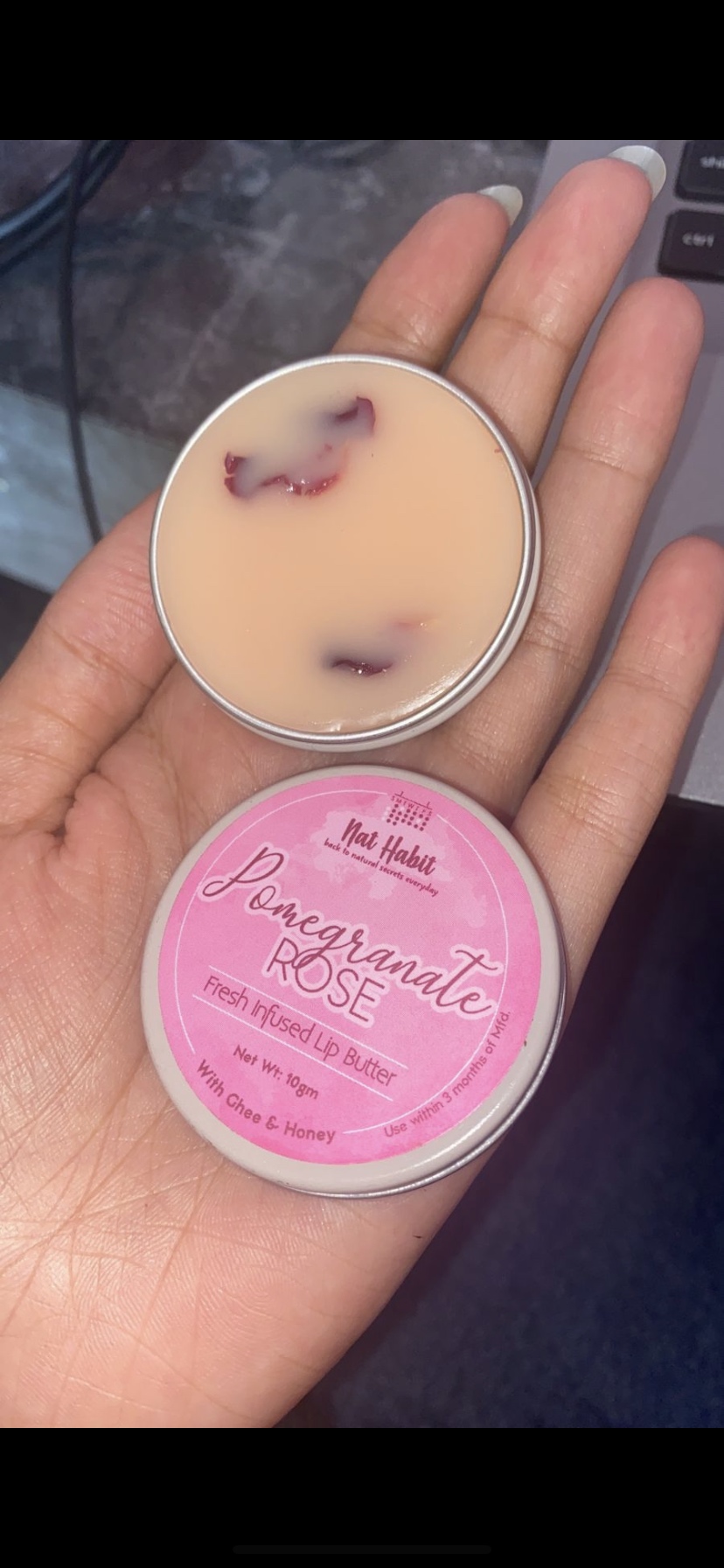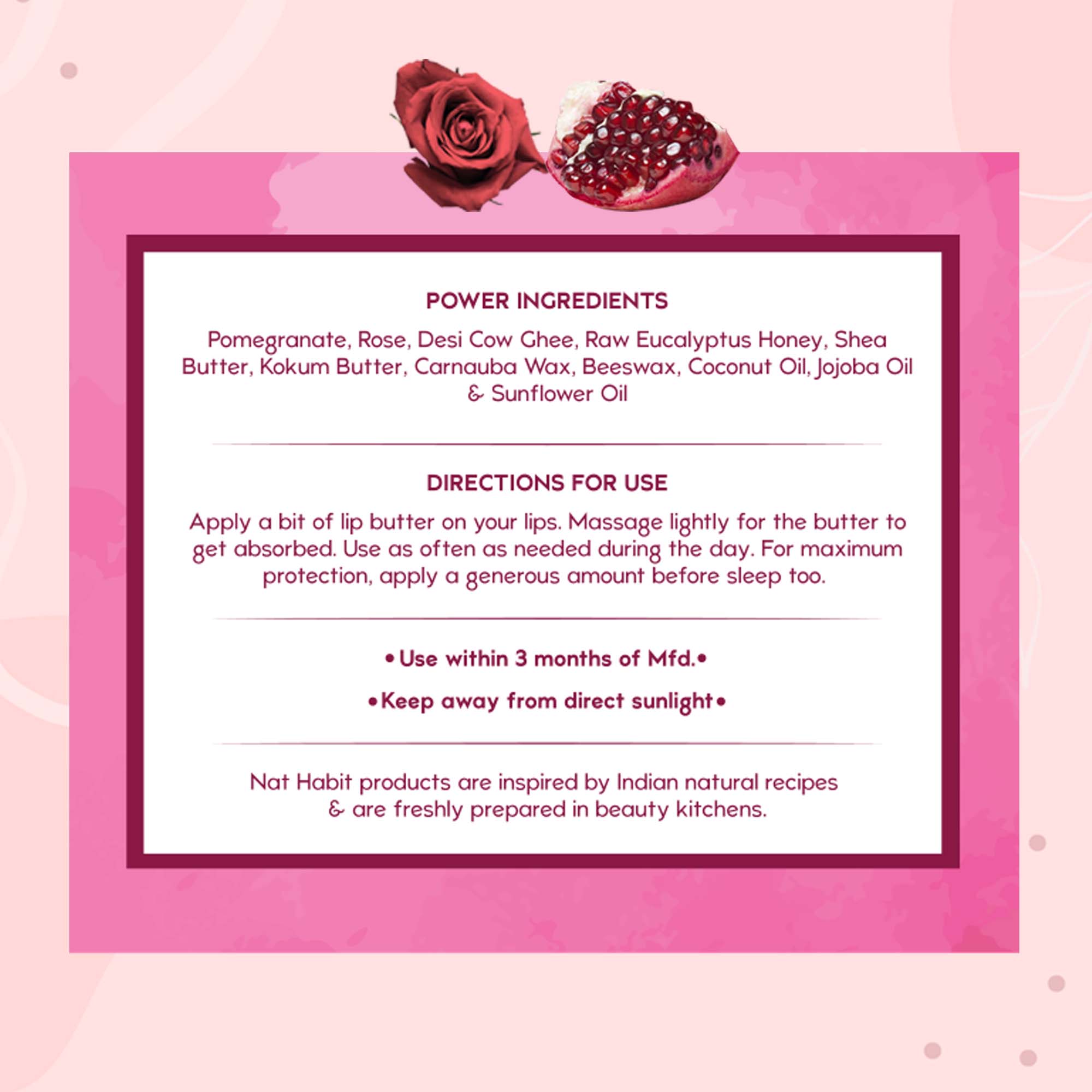 - Fresh Pomegranate, Rose, Desi Cow Ghee, Raw Eucalyptus Honey, Shea Butter, Kokum Butter, Carnauba Wax, Beeswax, Coconut Oil, Jojoba Oil & Sunflower Oil