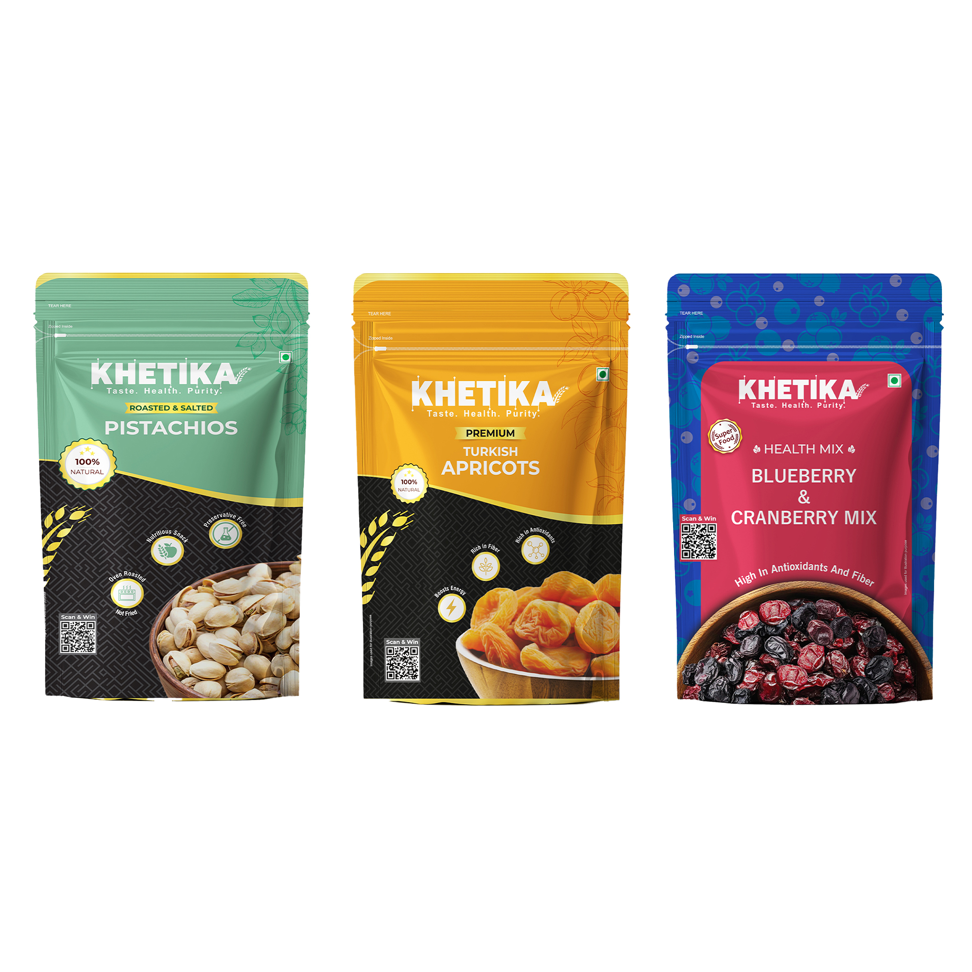 This exotic blend includes roasted pistachios, Turkish apricots, and cranberry-blueberry mix. Packed with antioxidants, vitamins, and minerals, it supports heart health and provides a gourmet snacking experience.