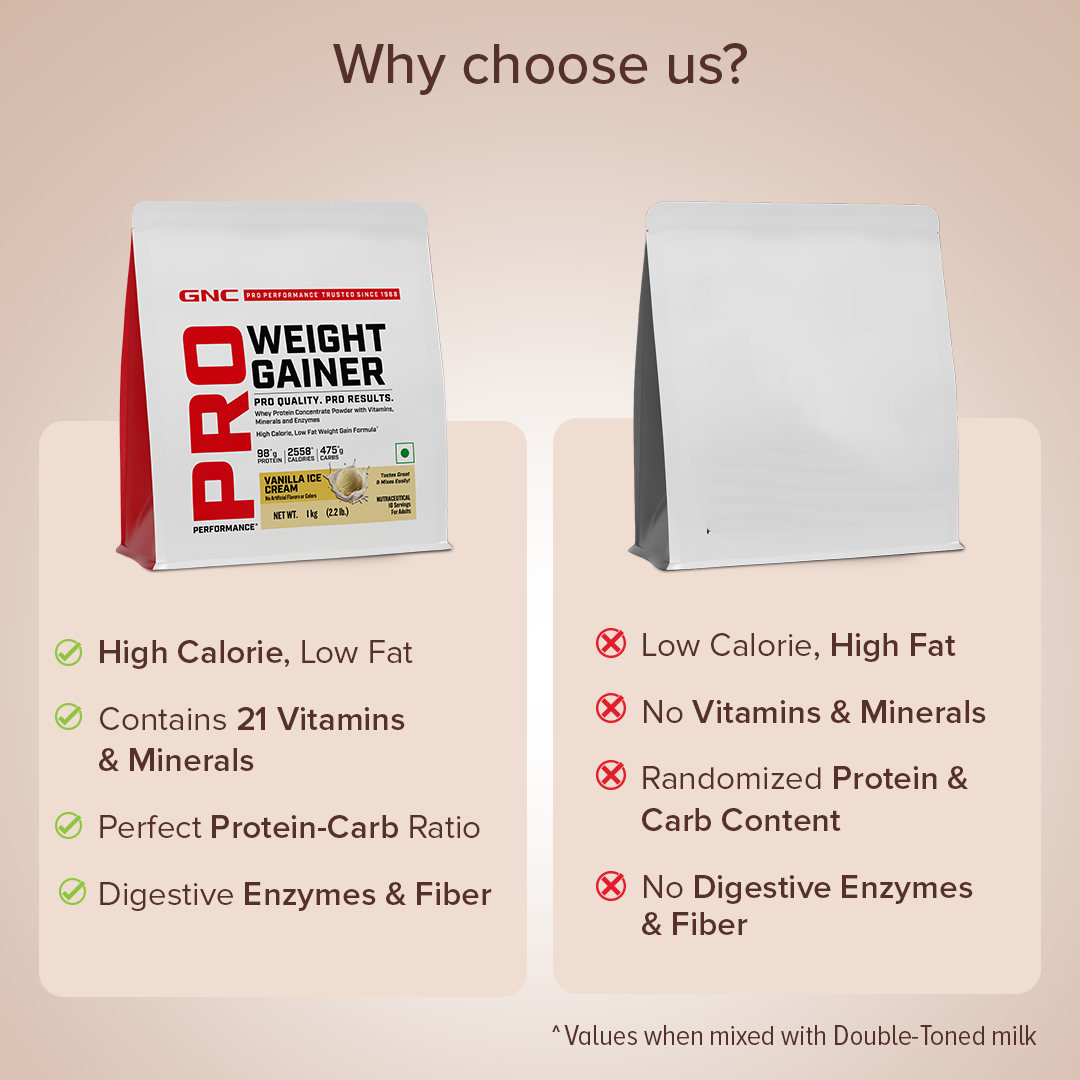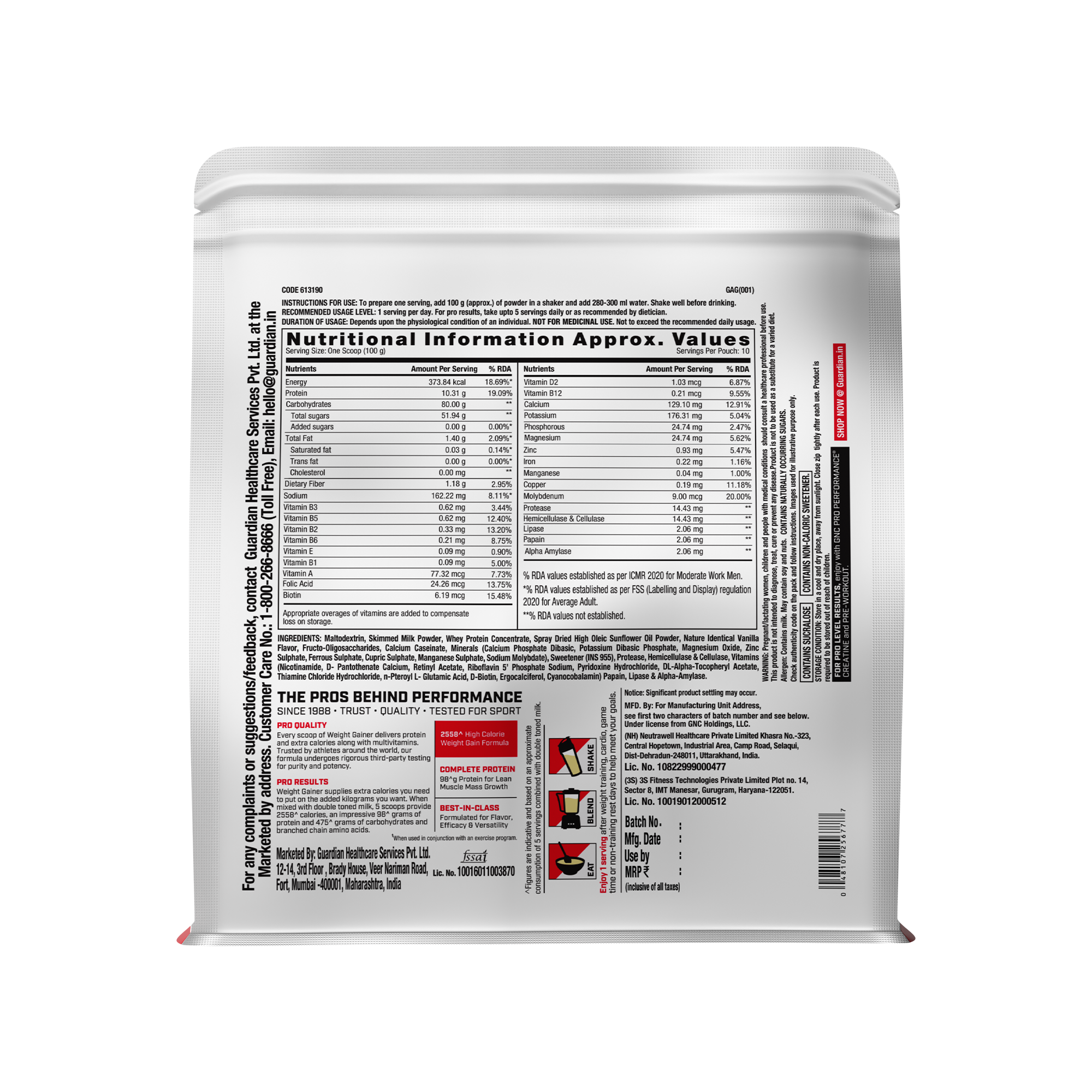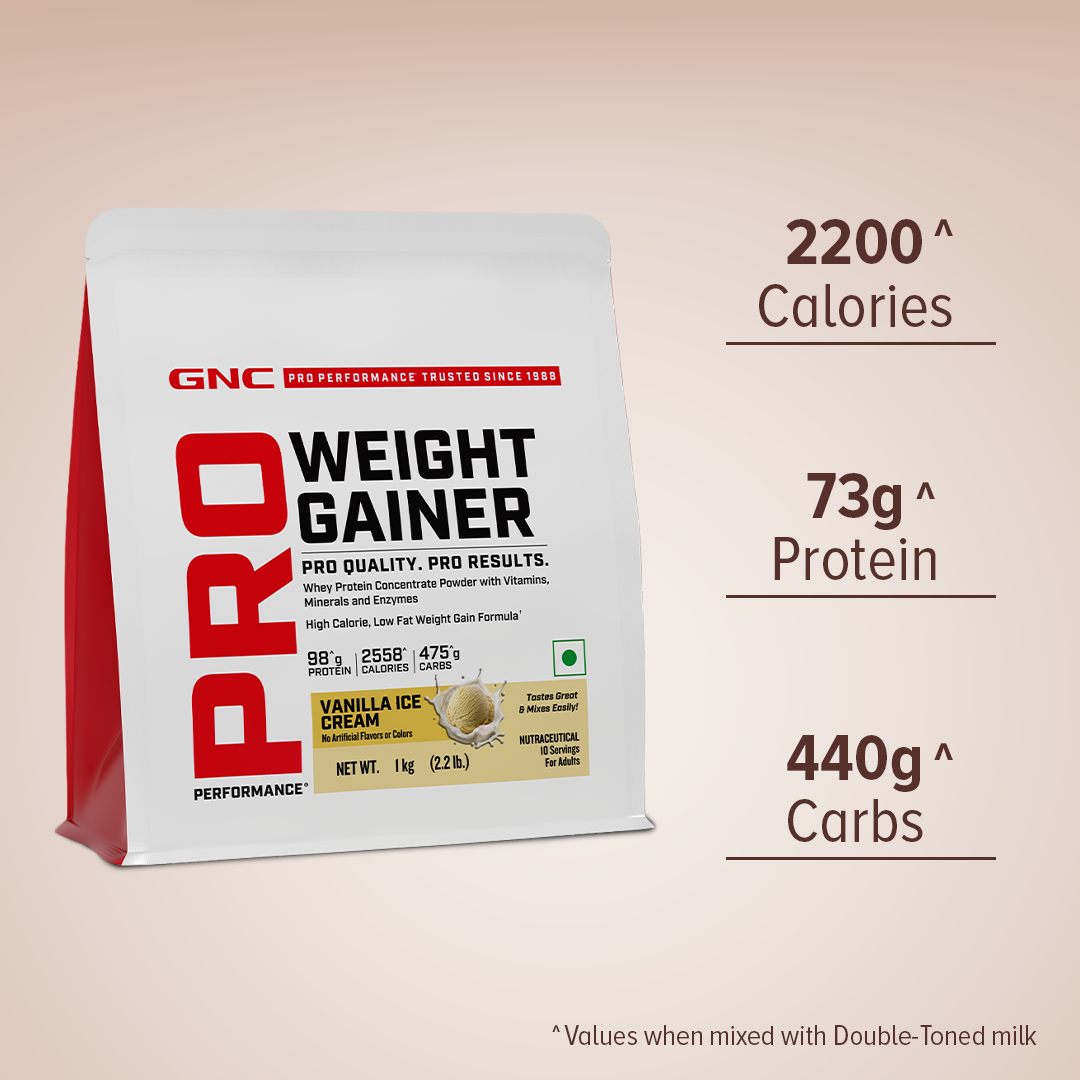 GNC Pro Performance Weight Gainer is a high-calorie, protein-rich supplement designed to help you build healthy weight and lean muscle mass without excess fat. Each serving (3 heaped scoops in double-toned milk) delivers a powerful 2200 calories, 73g protein, and 440g carbs, making it ideal for hard gainers and athletes with intense training schedules.