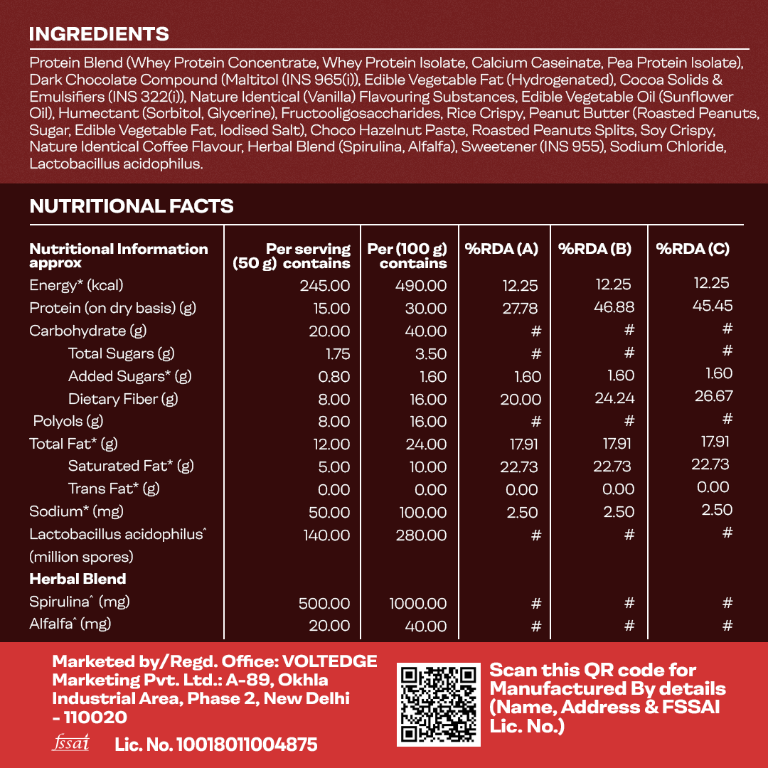 Protein Blend (Whey Protein Concentrate, Whey Protein Isolate, Calcium Caseinate, Pea Protein Isolate), Dark Chocolate Compound (Maltitol (INS 965(ii)), Edible Vegetable Fat (Hydrogenated), Cocoa Solids & Emulsifiers (INS 322(i))), Nature Identical (Vanil