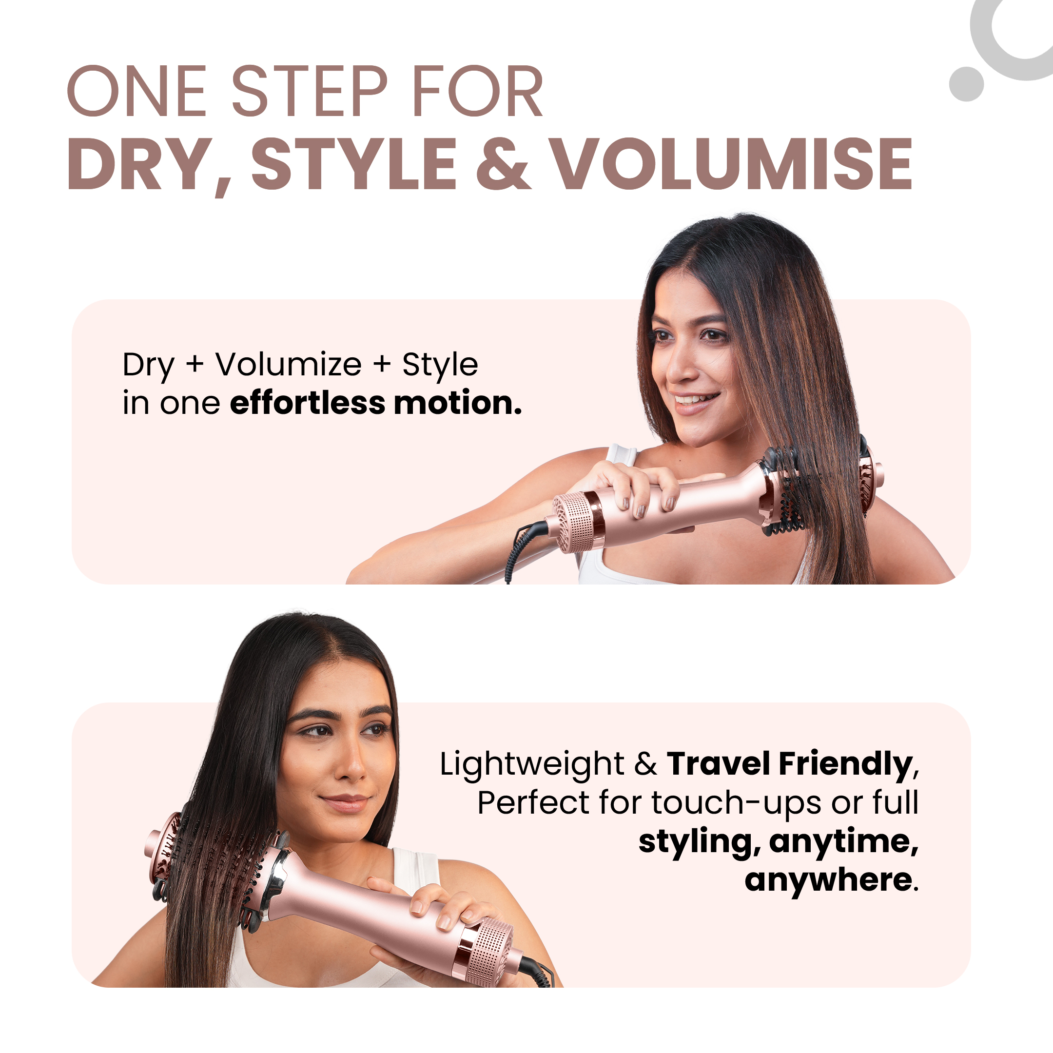 Upgrade your daily hair routine with Born To Shine 2-in-1 Styling Blow Brush, your ultimate styling companion. This multi-functional brush combines a powerful blow-dryer with a ceramic-coated styling barrel to dry, straighten, and volumize in one go. The ceramic coating distributes heat evenly to reduce frizz and prevent hot spots, & it adds instant shine and smoothness.