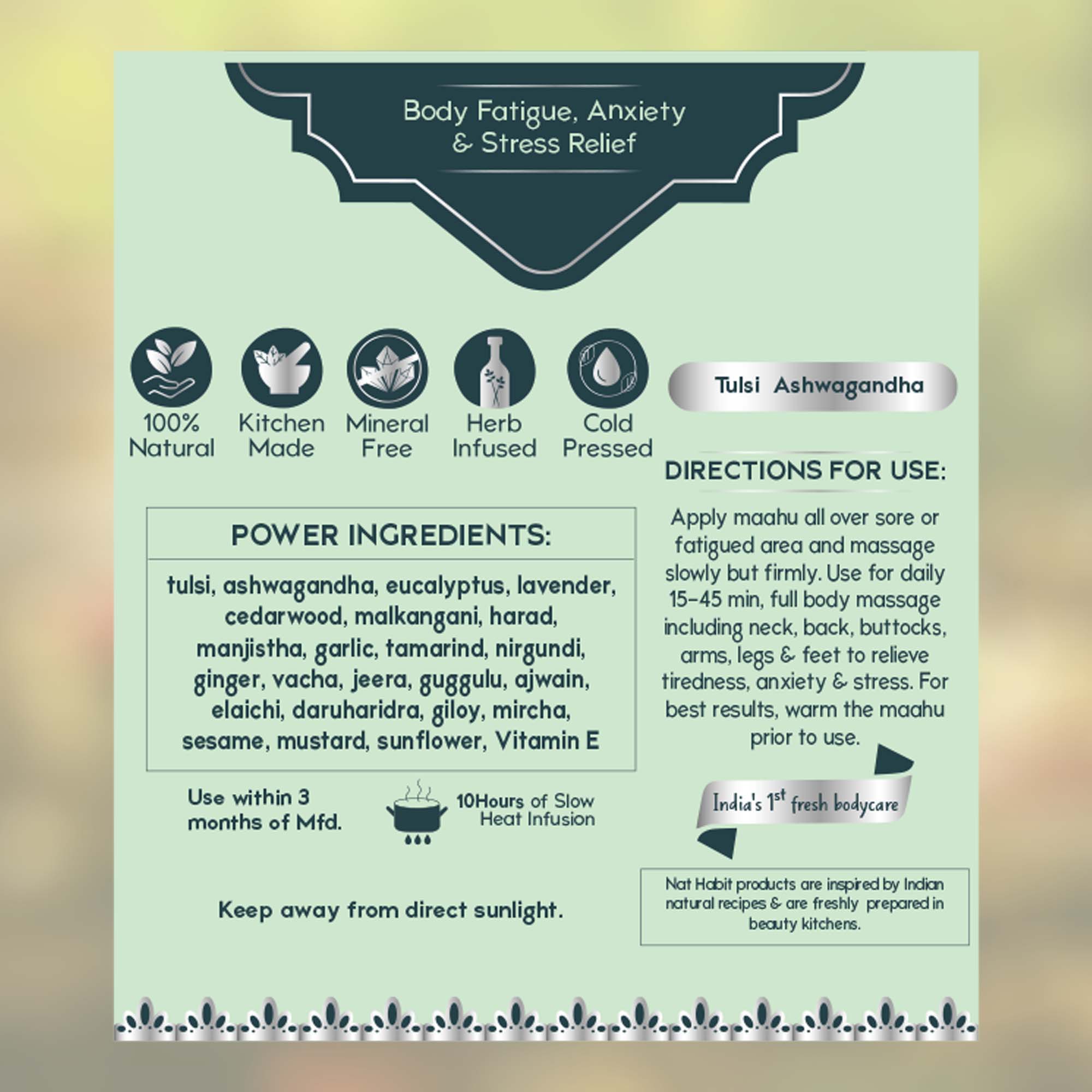 Pure Body Maahu, slow heat infused & fresh blended with 23 oils, herbs & spices. 'Maahu' signifies the ultimate state of wellness when our inner & outer consciousness merge. For generations, this state of wellness has been attained through slow & firm body massages with herbed oils. Massaging with Maahu helps release stress, anxiety and fatigue of both mind & body, bringing a state of blissful relaxation.