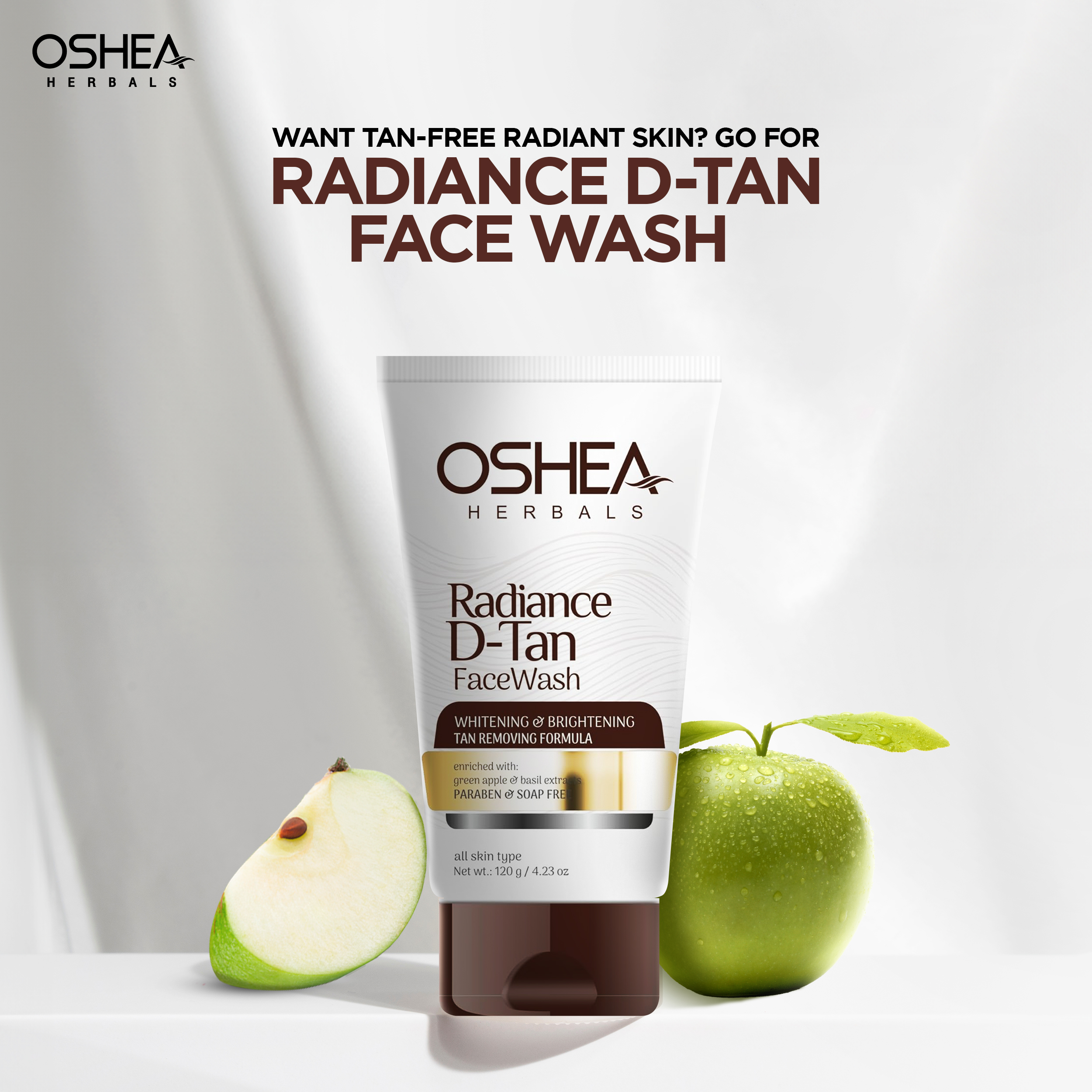 Oshea Herbals D-tan face wash is specially formulated with botanical extracts Basil, Green apple and Emblica. D-tan face wash cleanses the skin, it effectively works to wash away skin impurities, tanning and provides refreshed, oil free and even skin tone. This face wash can be used for all skin types including dry skin, oily skin, combination, and normal skin. It helps with concerns including blemishes, pigmentation, anti-ageing, dullness and sun damage control.