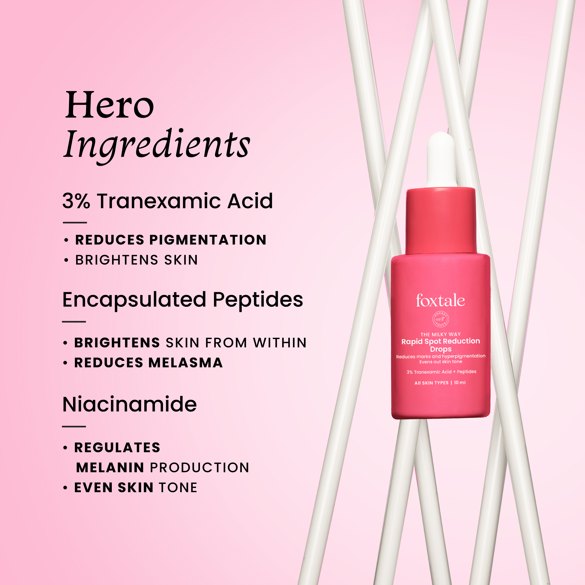 Aqua, Propylene Glycol, Dicaprylyl Carbonate, 3% W/W Tranexamic Acid, Glycerin, C15 19 Alkane, Diethylamino Hydroxybenzoyl Hexyl Benzoate, Water, Butylene Glycol, Hydrogenated Lecithin, Sodium Oleate, Oligopeptide 68, Disodium EDTA, Ceteareth 20, Niacinam