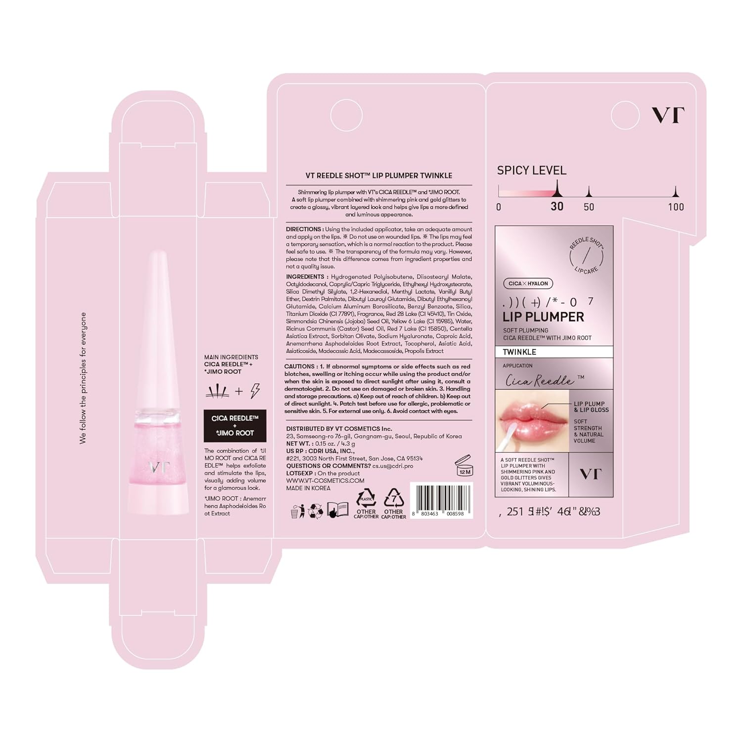VT Cosmetics Reedle Shot Lip Plumper Twinkle Glitter (4.3g) is a glossy lip plumper designed to deliver instant shine, visible volume, and a subtle glitter finish. Powered by VTs micro-spicule (reedle) technology, it creates a gentle tingling sensation that helps enhance lip fullness while improving lip texture over time. Formulated with moisturizing and conditioning ingredients, it helps smooth fine lines, reduce dryness, and keep lips soft and comfortable. Suitable for all lip types, especially dry or thin-looking lips, it can be worn alone for a glossy, plumped look or layered over lipstick for added shine and dimension. Apply directly to clean lips and reapply as needed throughout the day. A mild tingling sensation is normal after application; avoid use on cracked or irritated lips for best comfort.