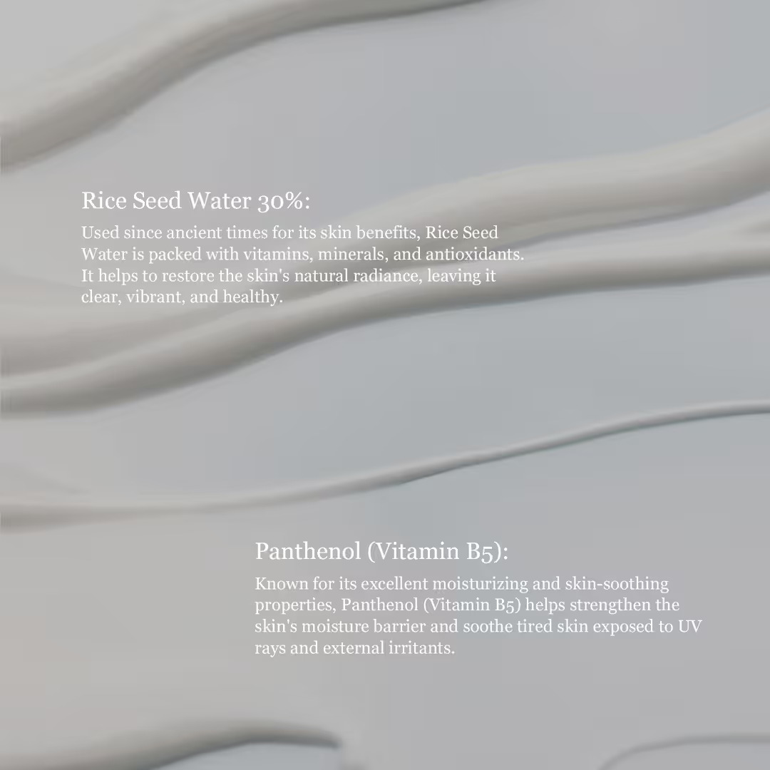 A refreshing, fast-absorbing sunscreen that delivers strong SPF50+ protection while keeping skin calm, soft, and hydrated. Infused with rice extract and provitamin B5, it helps maintain moisture balance, soothe irritation, and shield skin from environmental stressors. Leaves a smooth, non-greasy finish ideal for everyday wear.