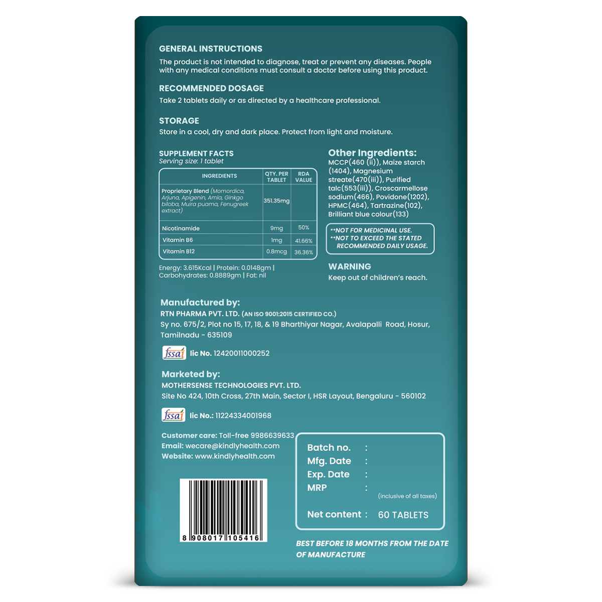 Formulated with Vitamin B6 & B12 , these capsules help maintain optimal energy levels , while Arjuna supports healthy blood pressure management . Apigenin & Amla contribute to blood vessel health, and Ginkgo Biloba & Niacin aid in improving oxygen flow , reducing fatigue , and keeping you active throughout the day.