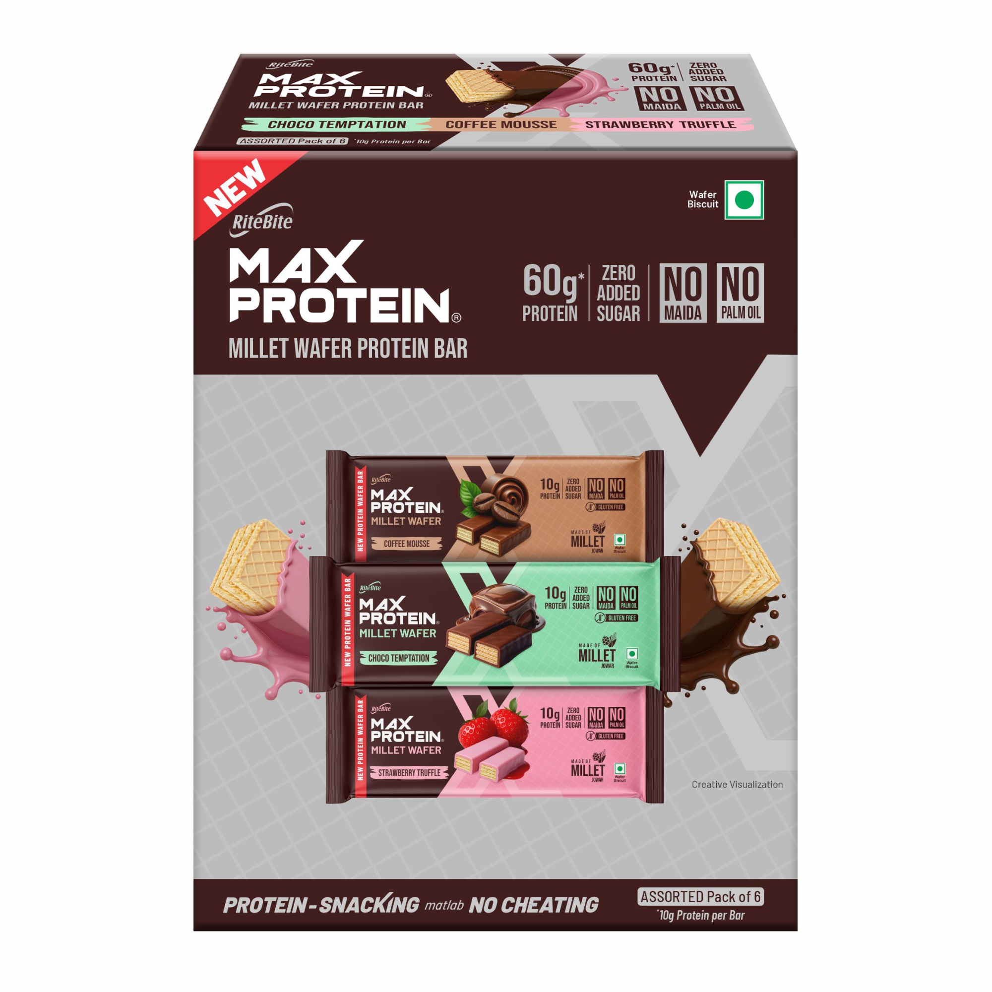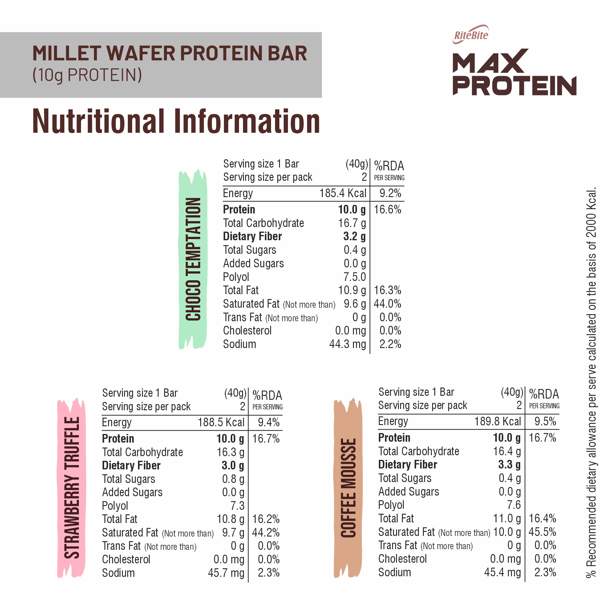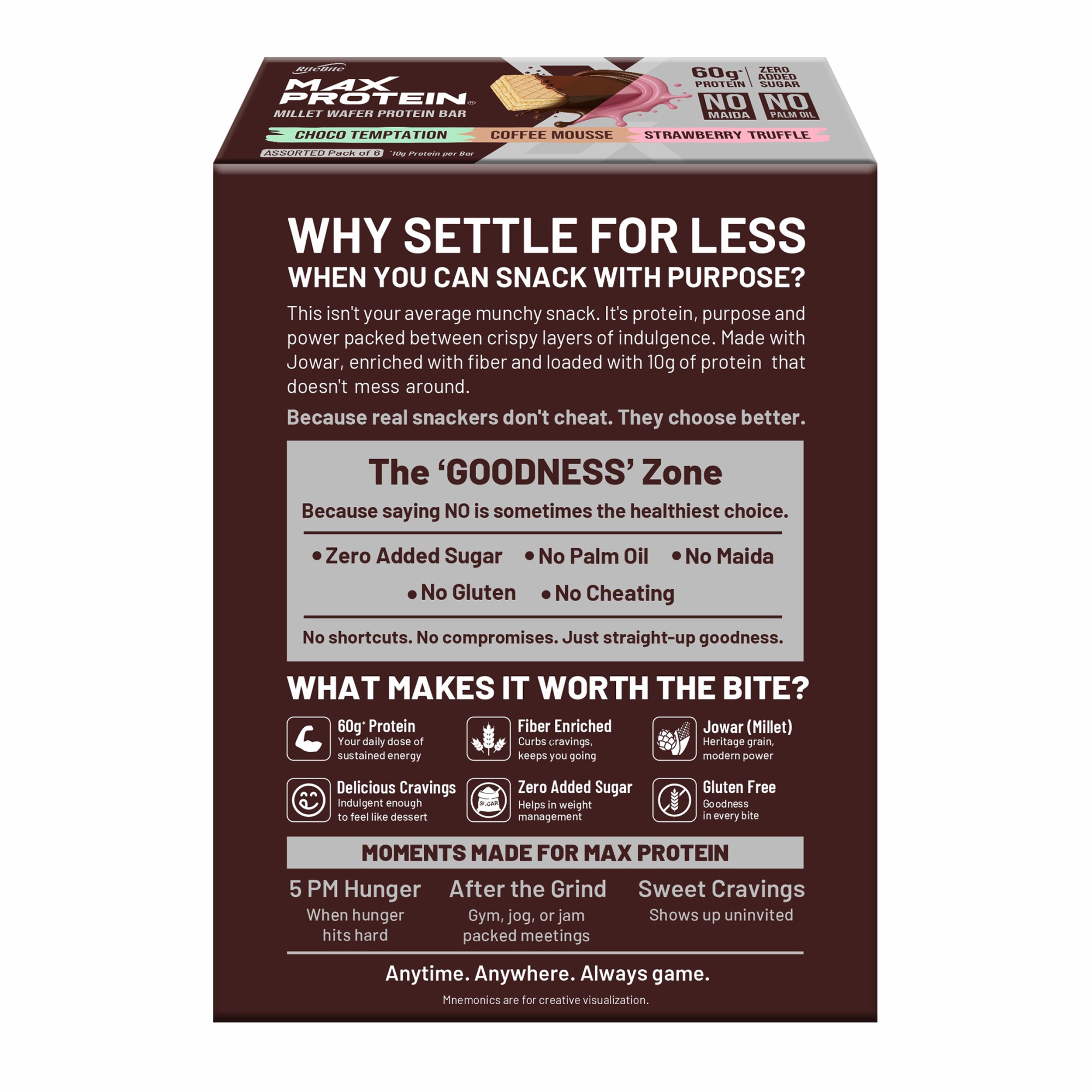 MILLET PROTEIN WAFER BAR - POWERED BY JOWAR: Packed with the goodness of millets, this crunchy wafer bar blends ancient grains like Jowar with modern nutrition to give you 10g of protein in every bite. Smart snacking, redefined.