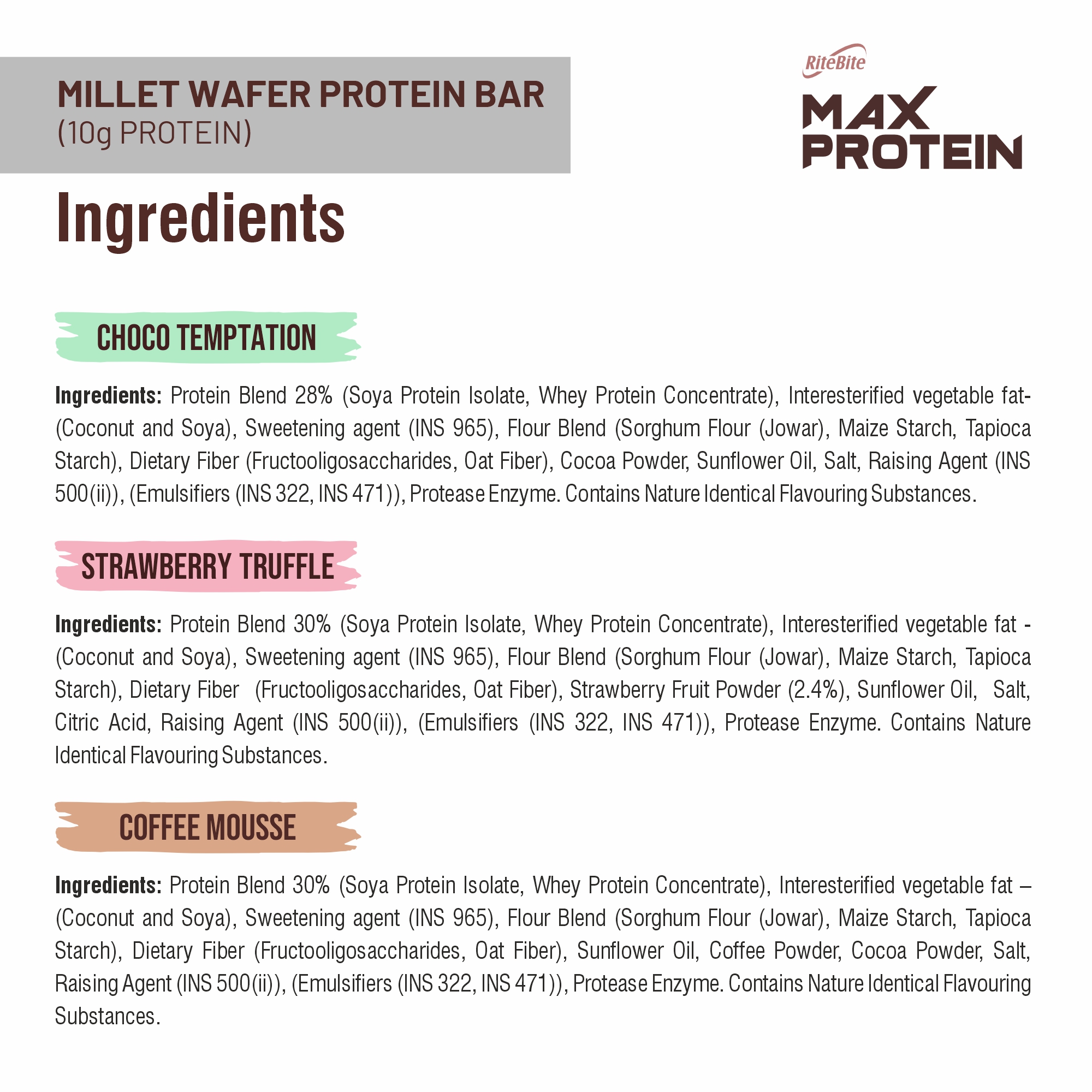 Protein Blend 28% (Soya Protein Isolate, Whey Protein Concentrate), Interesterified vegetable fat -(Coconut and Soya), Sweetening agent (INS 965), Flour Blend ((Sorghum Flour (Jowar), Maize Starch, Tapioca Starch)), Dietary Fiber (Fructooligosaccharides,