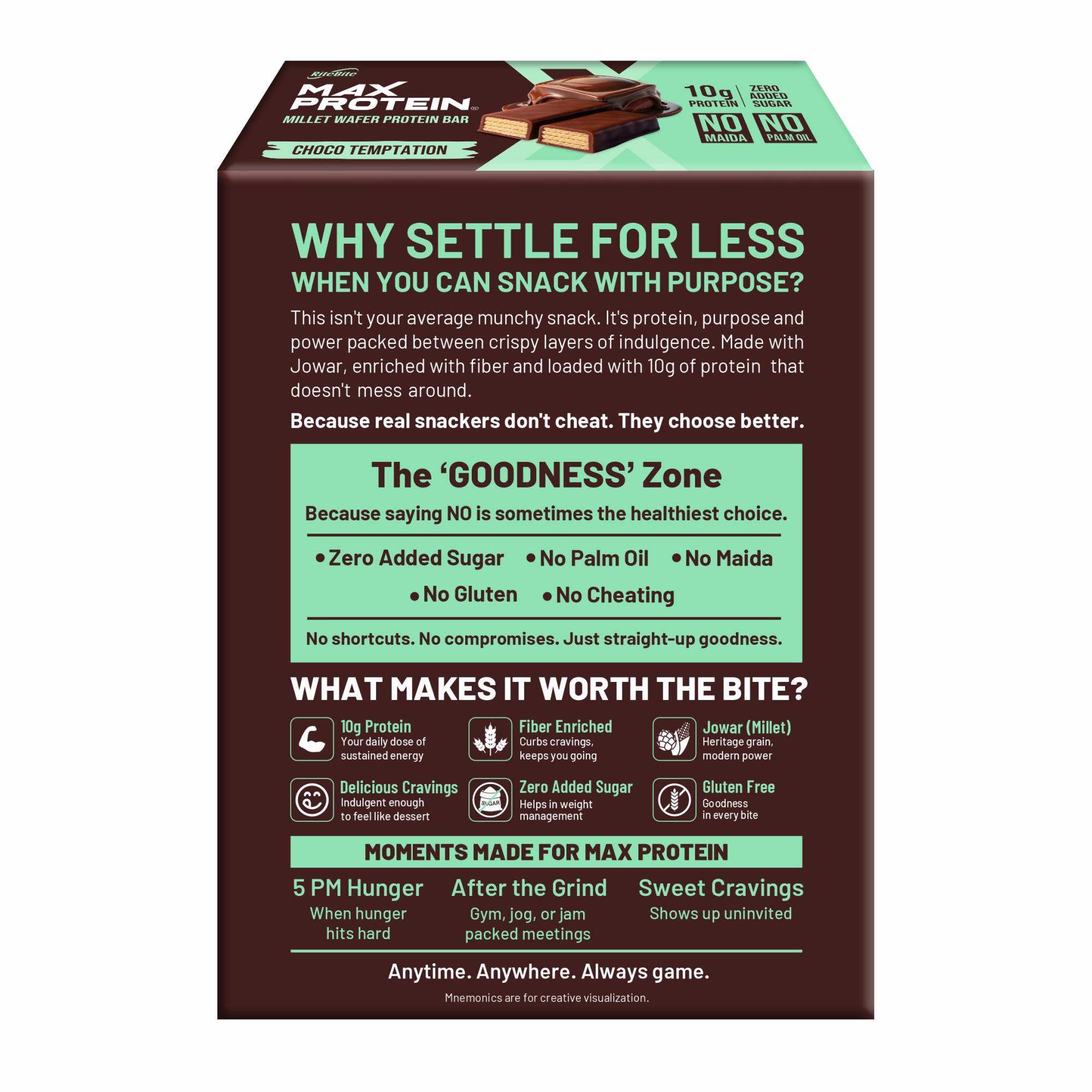 MILLET PROTEIN WAFER BAR - POWERED BY JOWAR: Packed with the goodness of millets, this crunchy wafer bar blends ancient grains like Jowar with modern nutrition to give you 10g of protein in every bite. Smart snacking, redefined.