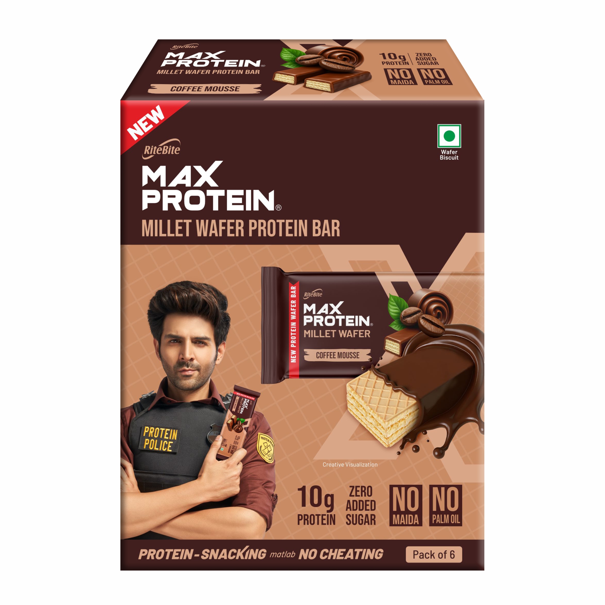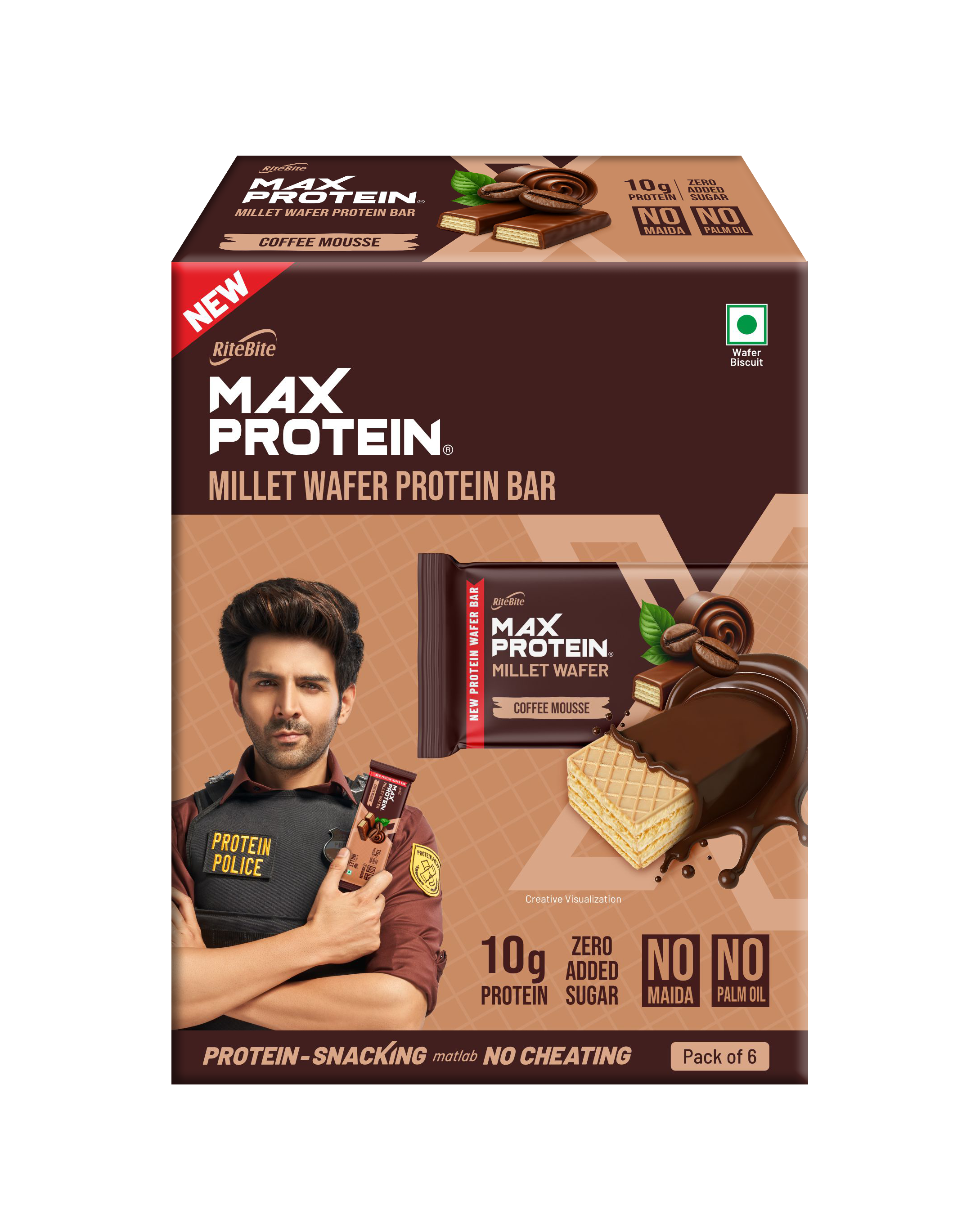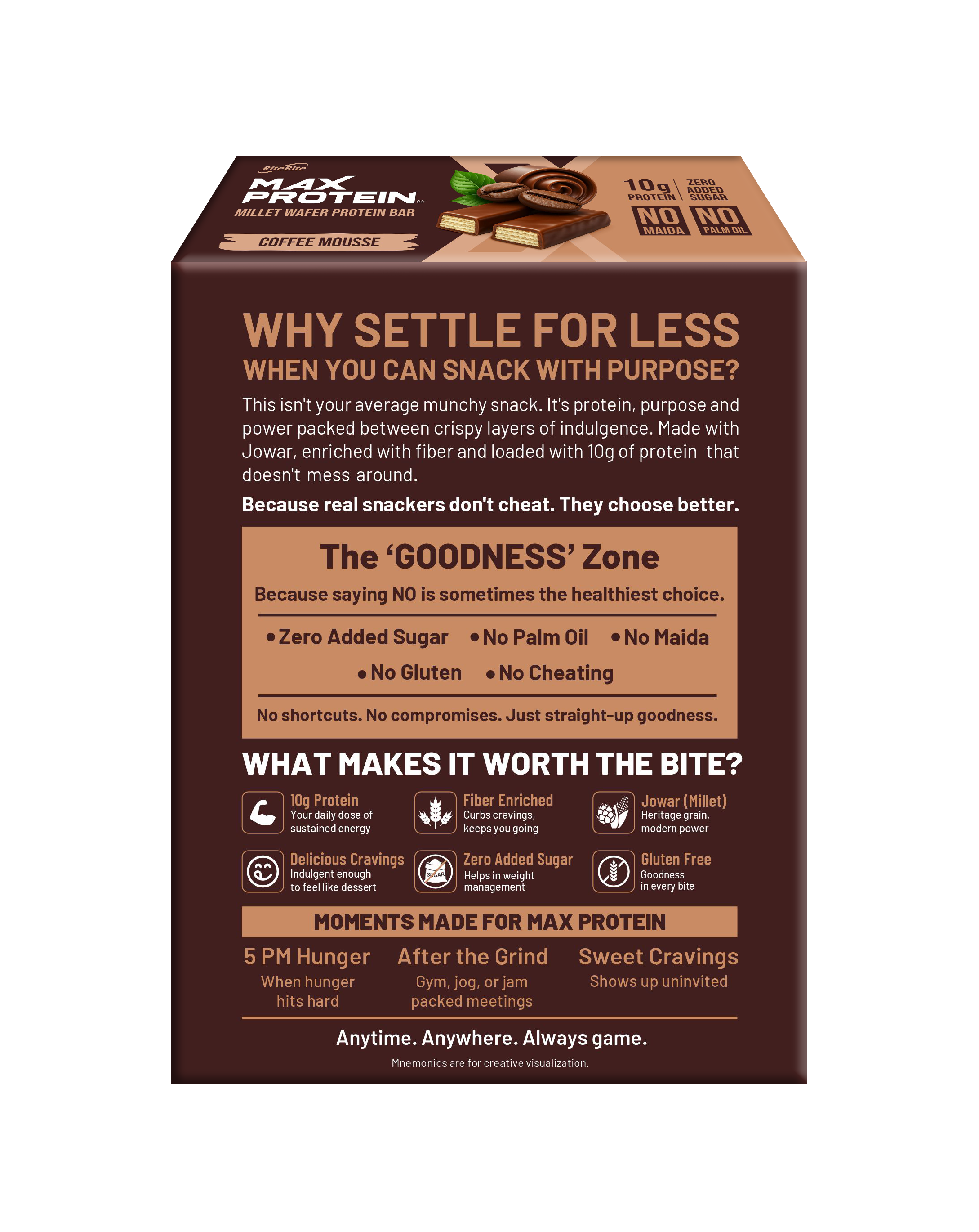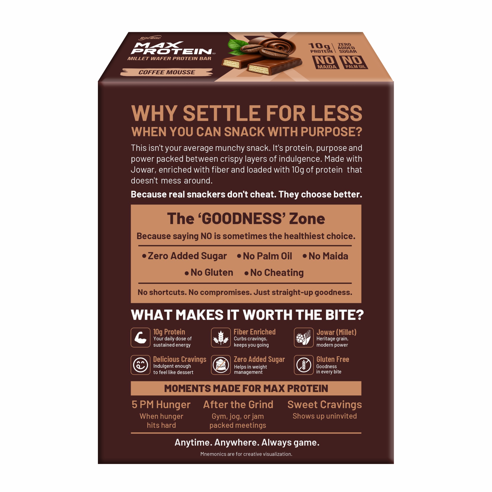 MILLET PROTEIN WAFER BAR - POWERED BY JOWAR: Packed with the goodness of millets, this crunchy wafer bar blends ancient grains like Jowar with modern nutrition to give you 10g of protein in every bite. Smart snacking, redefined.