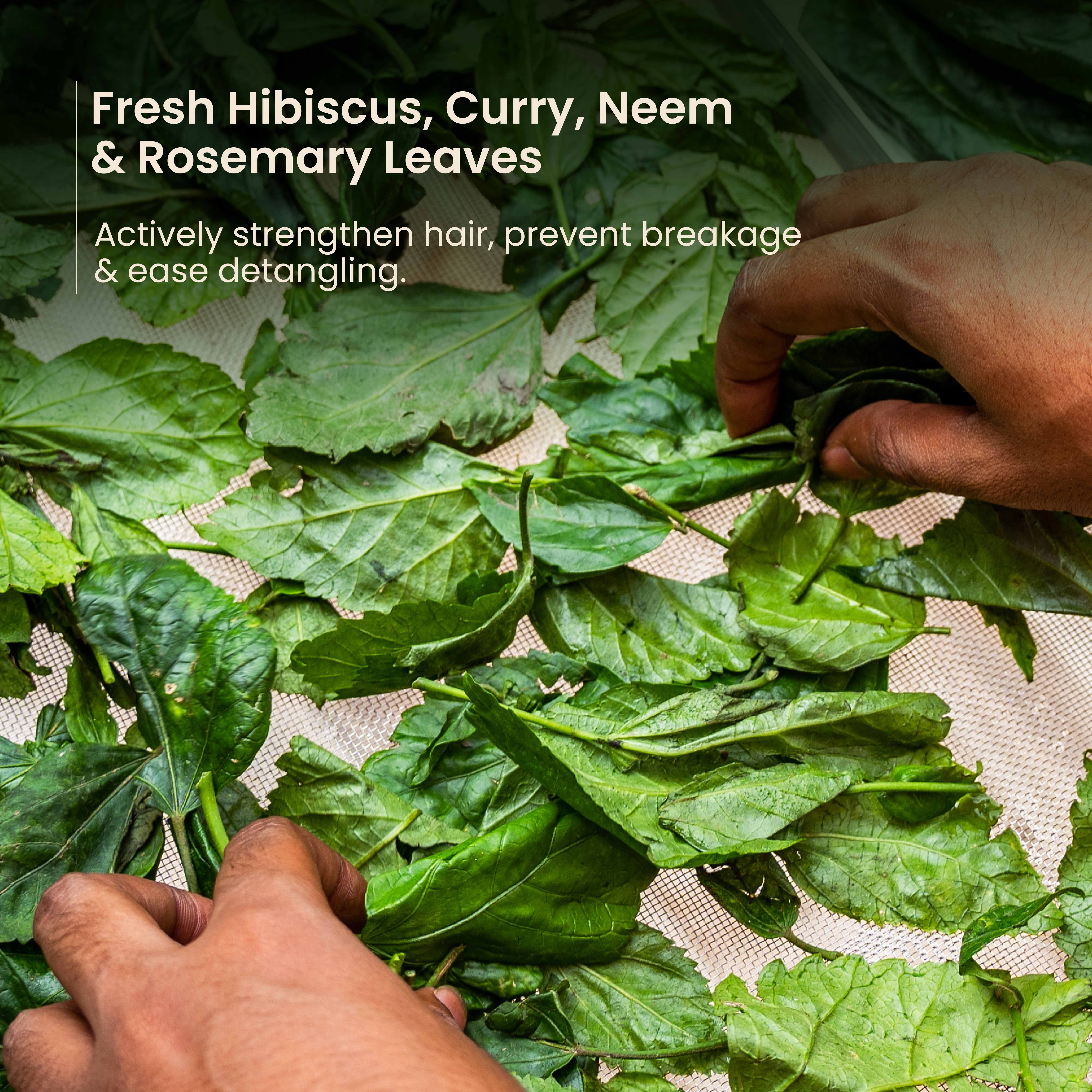 Tangle-Free Hair: A blend of hibiscus, curry, neem, and rosemary leaves ensures smooth, easily detangle hair, making styling a breeze.