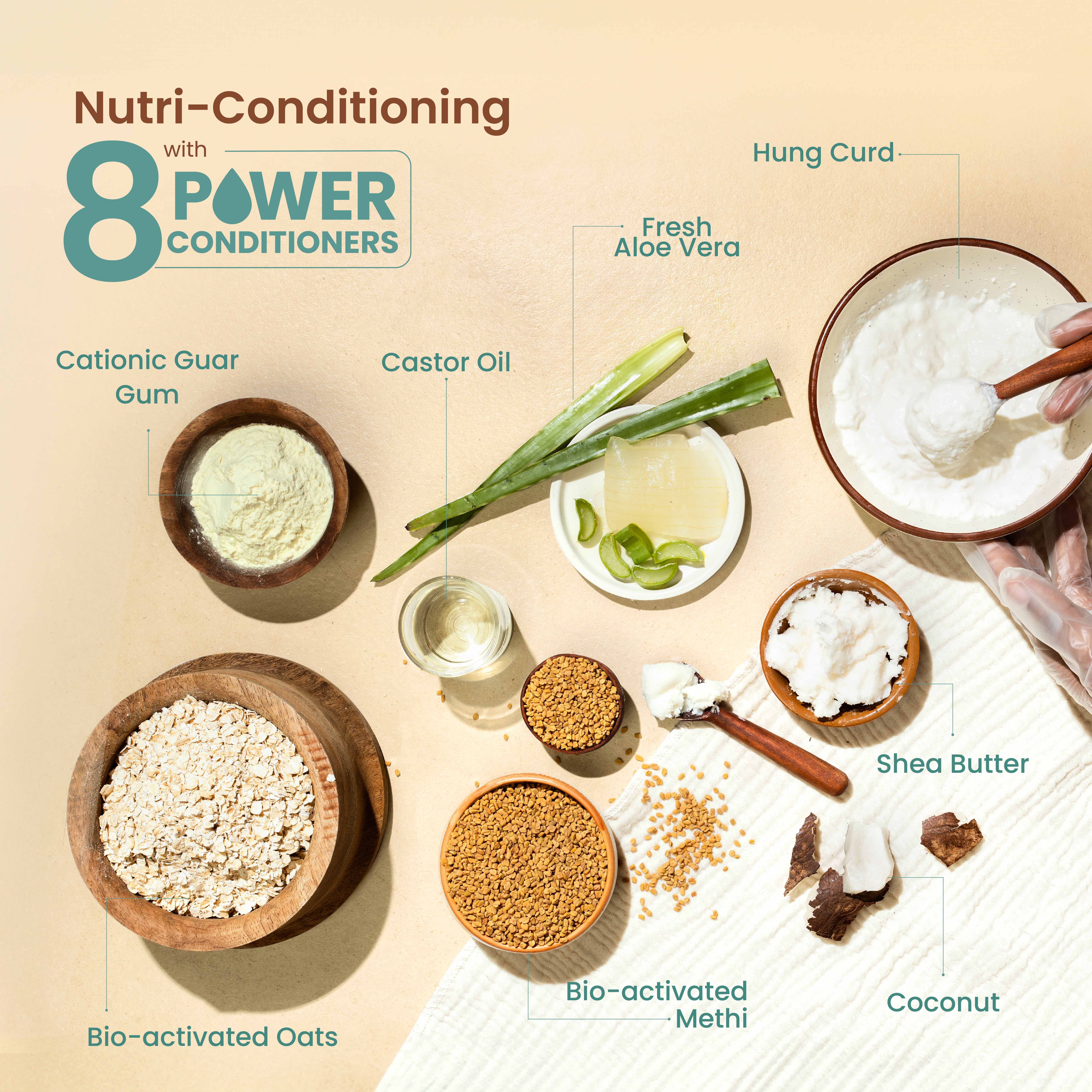 Hung curd, bio-activated methi, bio-activated oats, soy protein, shea butter, castor oil, coconut, fresh aloe vera, cationic guar gum, hibiscus leaves, curry leaves, neem, rosemary, honey, apple cider vinegar, sesame cream, coconut derivatives (CCTG, coco caprylate), vegetable glycerin, PQ10 (cationic cellulose gum), salt, lactic acid, vit-E, xanthan gum, geogard(ecocert), HEC (cellulose gum), orange, palm oil esters, ambrette seed, black pepper, rose, black currant