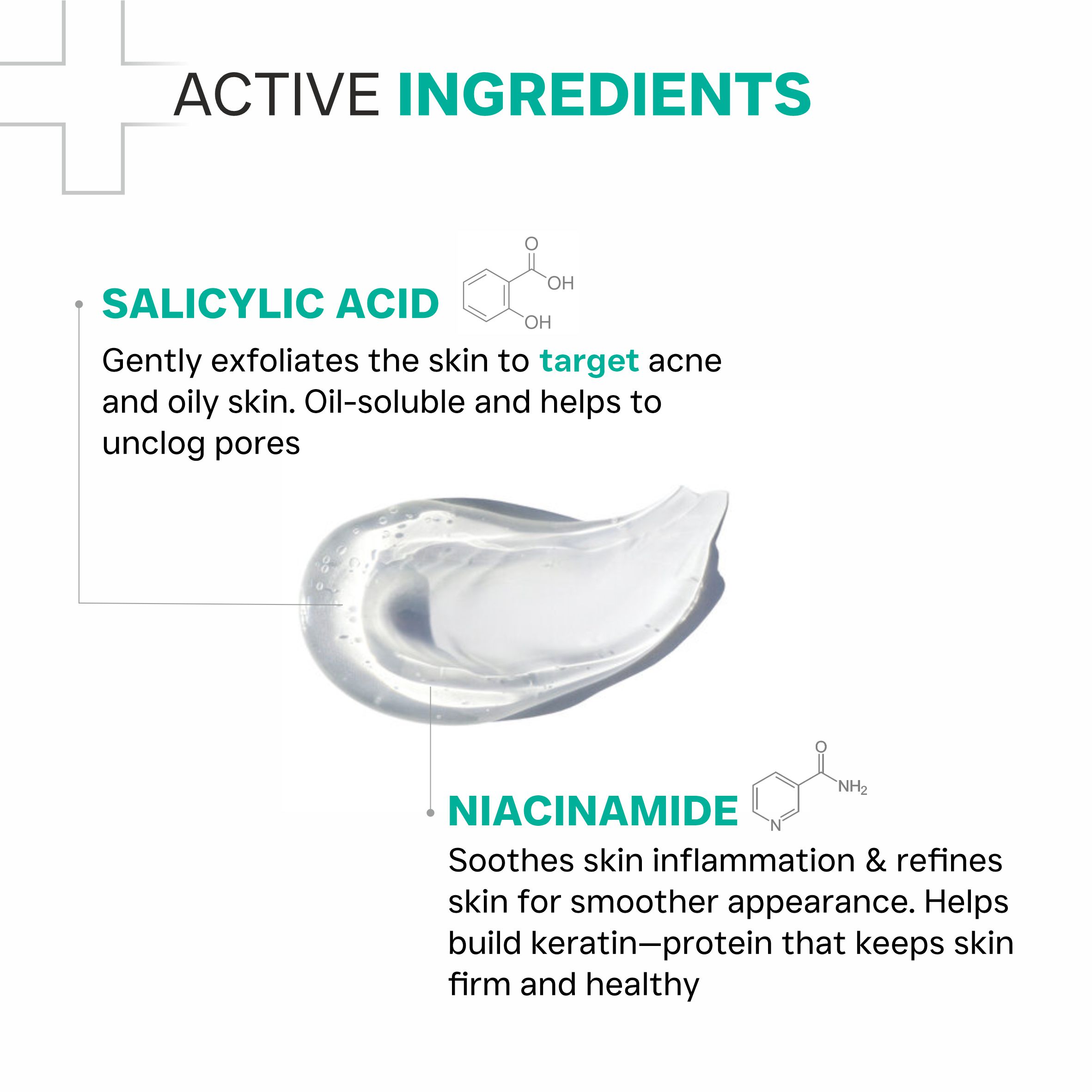 Aqua, Vitamin B3, Propylene Glycol, Salicylic Acid, Carbomer, Aloe Vera Extract, Allantoin, Sodium Hydroxide