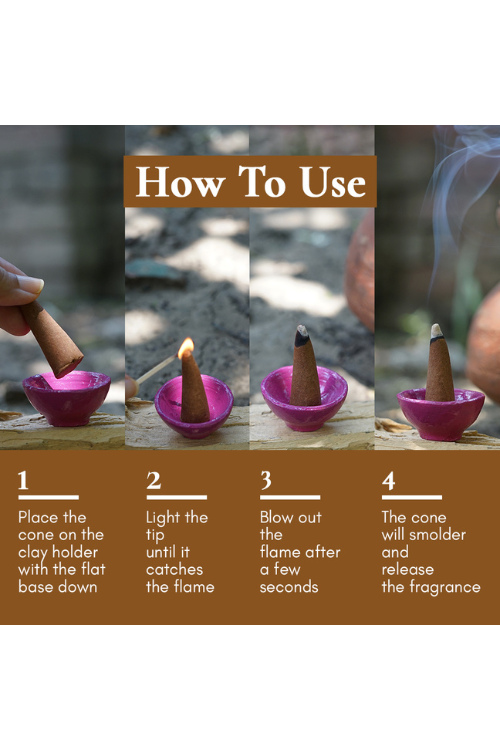 Place the cone on the clay holder with the flat base down. Light the tip until it catches the flame briefly and blow it out after a few seconds. The cone will smolder and release the fragrance.
