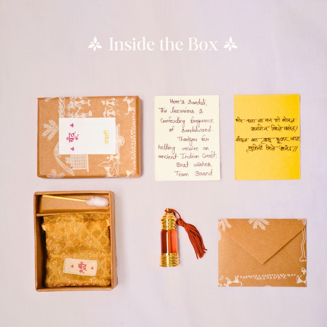 The classic fragrance:: The Boond Sandali (Sandalwood) fragrance is the luxurious and comforting fragrance of Sandalwood. Alcohol-free, natural & pure: The fragrance is completely pure and natural. It does not contain alcohol or any chemicals. It is made from natural materials that are sourced responsibly from across India. Handcrafted to evoke a feeling of comfort & luxury: Expertly handcrafted by artisans to evoke feelings of comfort and luxury. Earthy & woody notes: This is a unisex fragrance with earthy & woody notes that last 6-8 hours. 100% authentic. G.I tagged: This product is conferred with the Geographical Indicator (GI) Tag by the Government of India for authentic Kannauj Perfume. Made sustainably: Each element of the box, from the fragrance to its packaging are made from ethically and locally sourced materials. The making process is sustainable, cruelty-free and environmentally friendly. Handcrafted, plastic-free packaging: The fragrance box is crafted by artisans using recycled handmade paper from cotton scraps. The packaging is completely plastic free. Perfect & unique gift for special occasions: Each handmade box is a unique and cherished gift for any occasion for friends, families and colleagues.