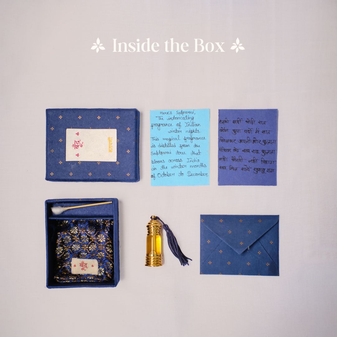 Unique, intoxicating fragrance: The Boond Satparni fragrance is the inviting and intoxicating fragrance of the Saptaparini tree that blooms on Indian winter nights. Alcohol-free, natural & pure: The fragrance is completely pure and natural. It does not contain alcohol or any chemicals. It is made from natural materials that are sourced responsibly from across India. Handcrafted to evoke warmth & nostalgia: Expertly handcrafted by artisans to evoke feelings of warmth, joy and nostalgia. Green & fresh notes: This is a unisex fragrance with green & fresh notes that last 6-8 hours. 100% authentic. G.I tagged: This product is conferred with the Geographical Indicator (GI) Tag by the Government of India for authentic Kannauj Perfume. Made sustainably: Each element of the box, from the fragrance to its packaging are made from ethically and locally sourced materials. The making process is sustainable, cruelty-free and environmentally friendly. Handcrafted, plastic-free packaging: The fragrance box is crafted by artisans using recycled handmade paper from cotton scraps. The packaging is completely plastic free. Perfect & unique gift for special occasions: Each handmade box is a unique and cherished gift for any occasion for friends, families and colleagues.