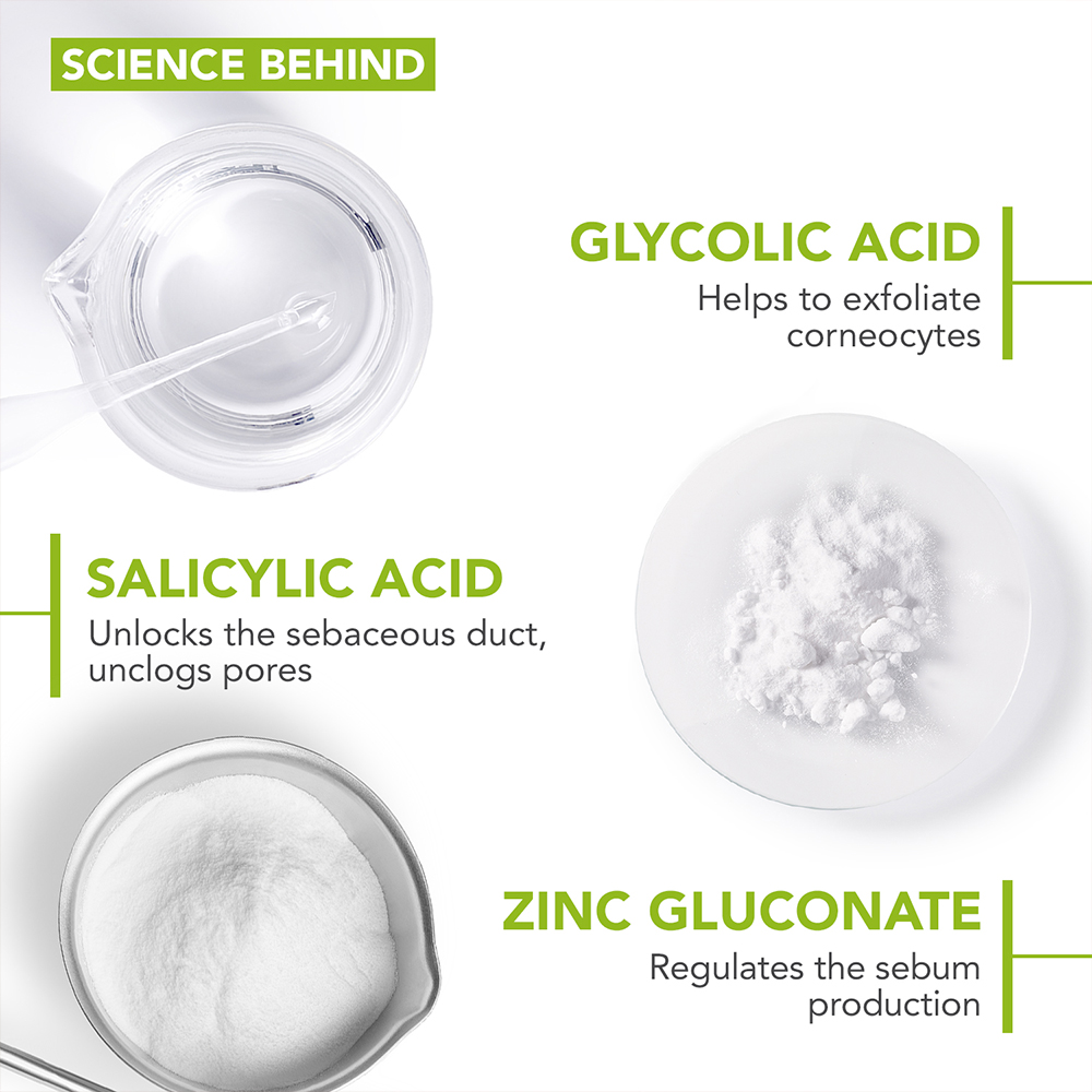 The combination of salicylic acid and glycolic acid helps unclog pores, reduce blemishes and refine skin texture