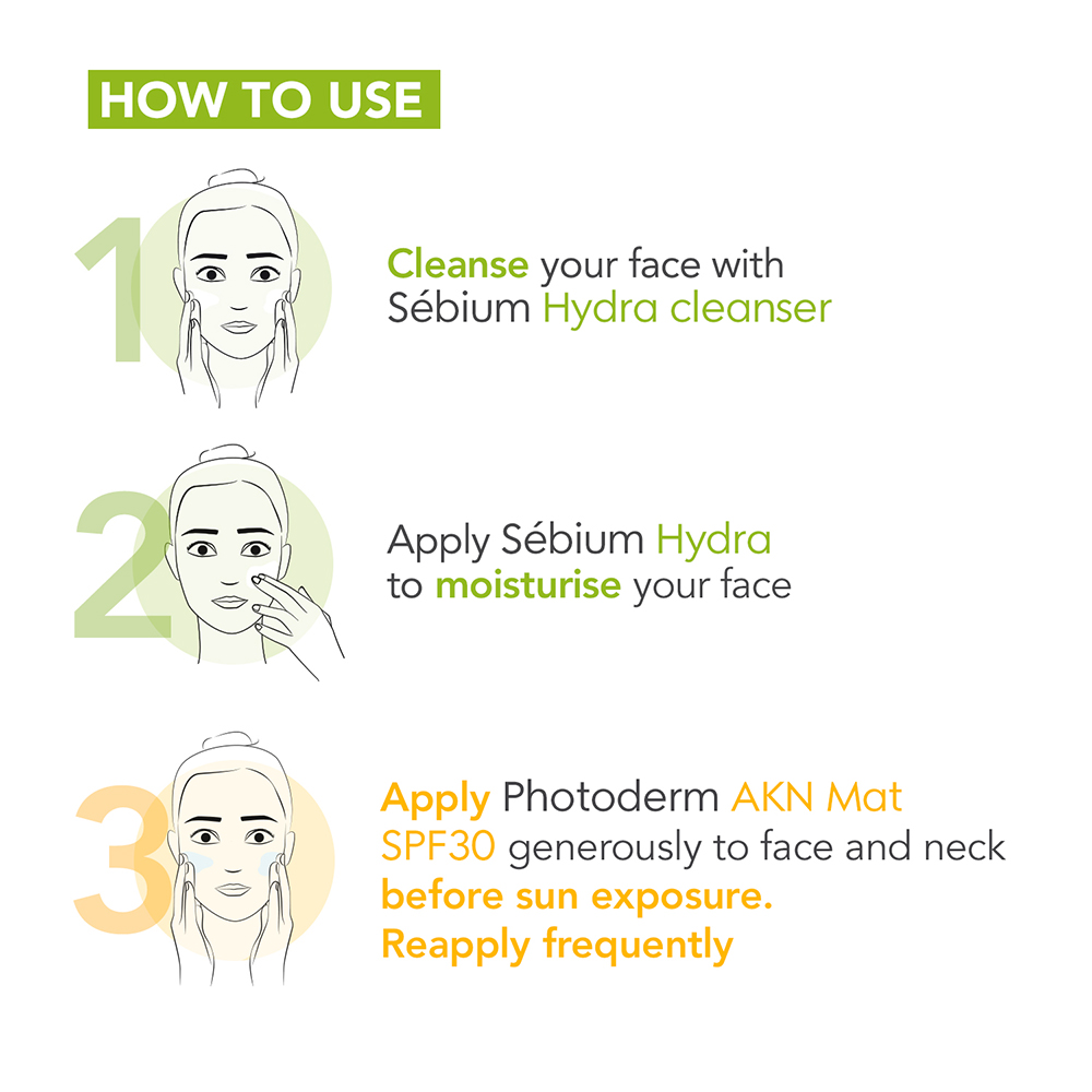 Apply morning and/or evening to wet skin. Massage gently and rinse thoroughly. Dry without rubbing. Can be used as a makeup remover. Then apply Sébium Hydra skincare.1. Cleanse skin with Sébium Hydra cleanser.