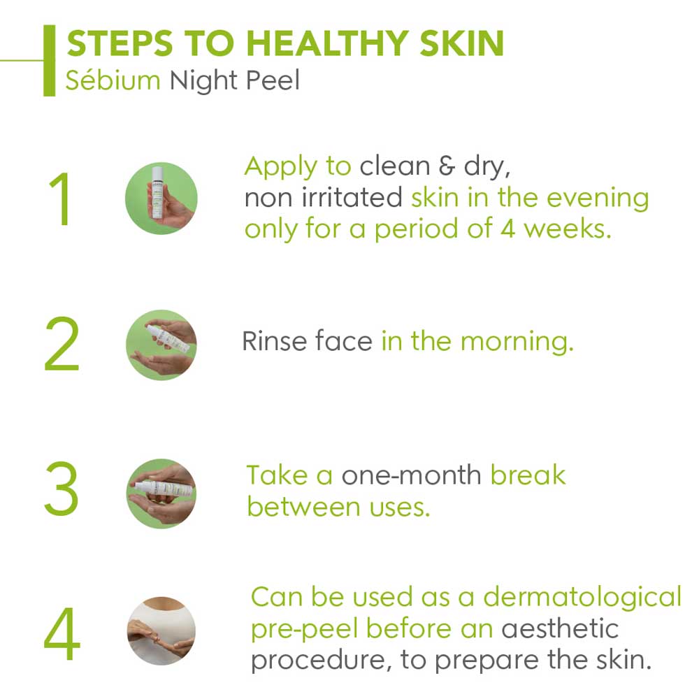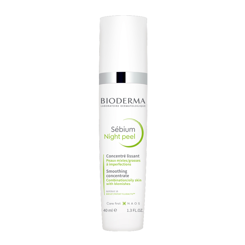 Sébium Night Peel offers the efficacy of a gentle peel at home for combination to oily skin with blemishes: - 15% Glycolic acid provides it with its peeling action. This AHA acid is naturally found in fruit and is frequently used by dermatologists for peels due to its high efficacy and tolerance. It has surface keratolytic action. It reduces blemishes and scarring while restoring radiance by promoting skin renewal. - The exclusive Fluidactiv patented complex biologically regulates sebum quality, keeping pores from becoming clogged and limiting the formation of blemishes. - D-Panthenol offers restructuring and soothing properties.