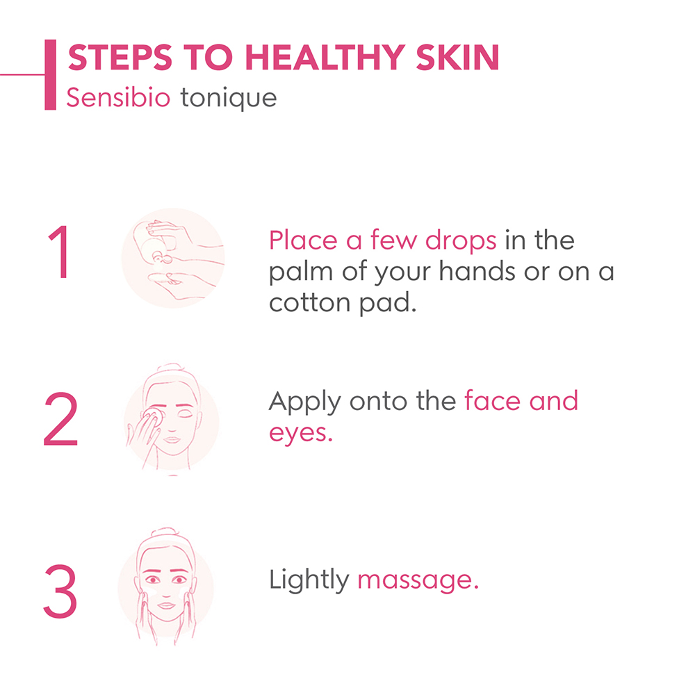 1. Place a few drops in the palm of your hands or on a cotton pad 2. Apply onto the face and eyes
