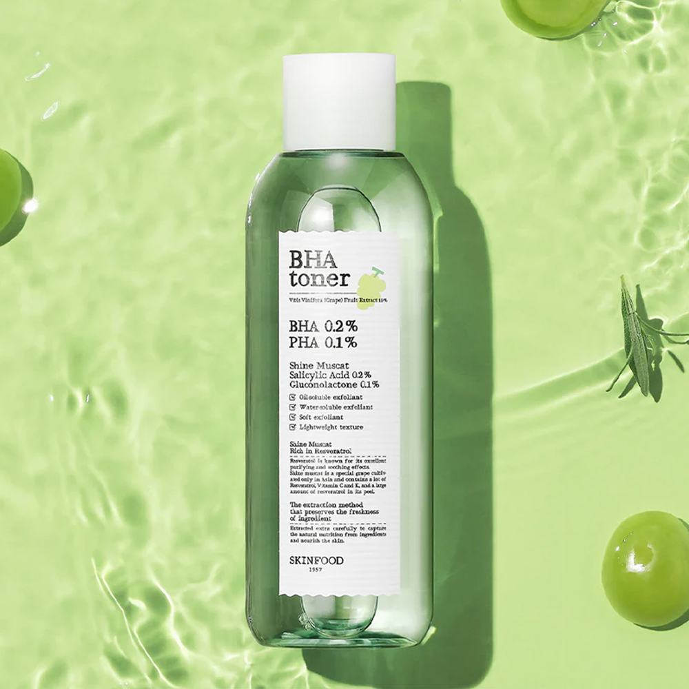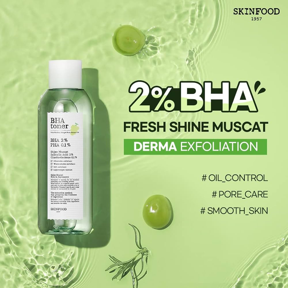 SKINFOOD Shine Muscat BHA Toner is lightweight, non-sticky, and suitable for all skin types, especially oily and combination skin. It preps your skin to absorb serums and moisturizers more effectively, making it a vital step in your daily skincare routine.