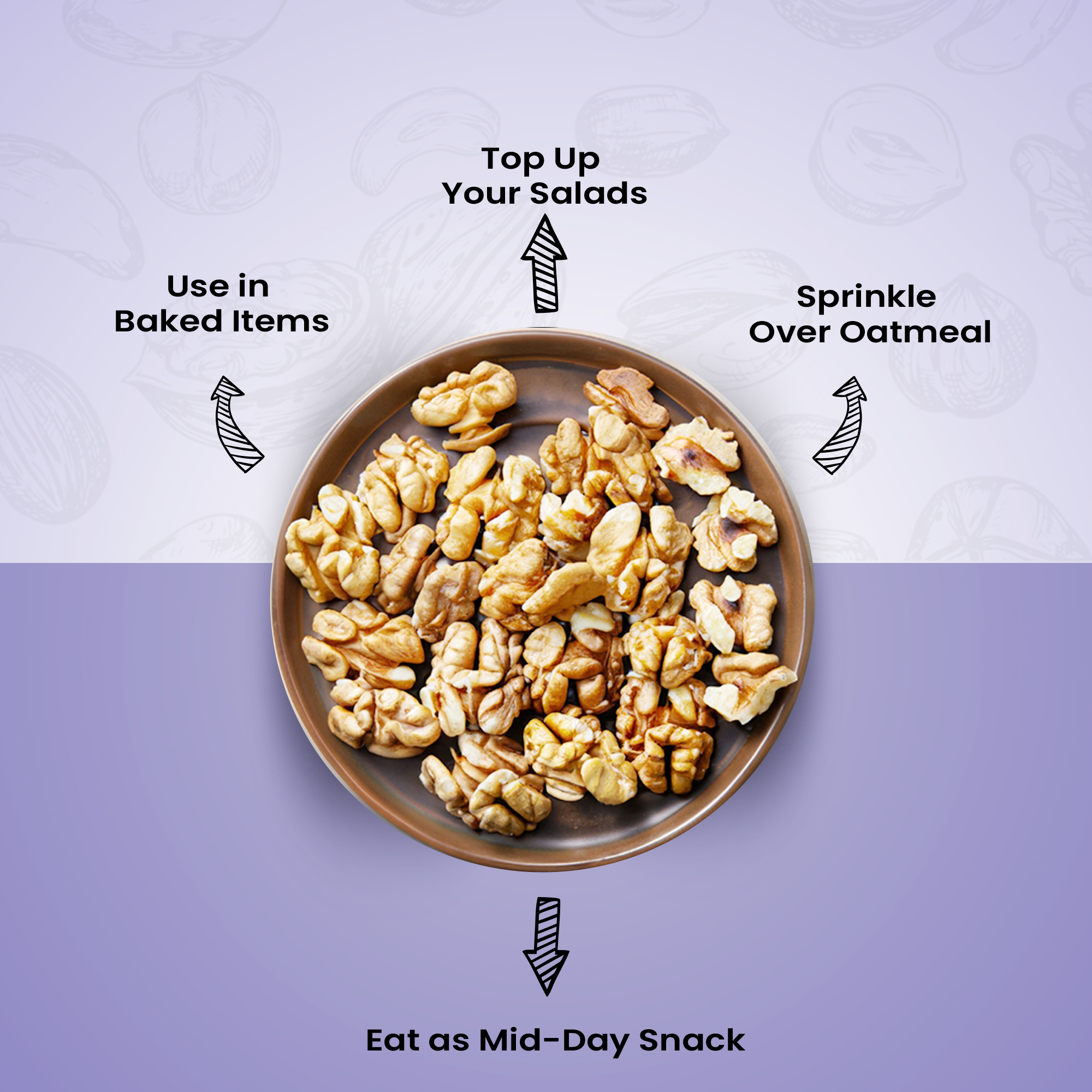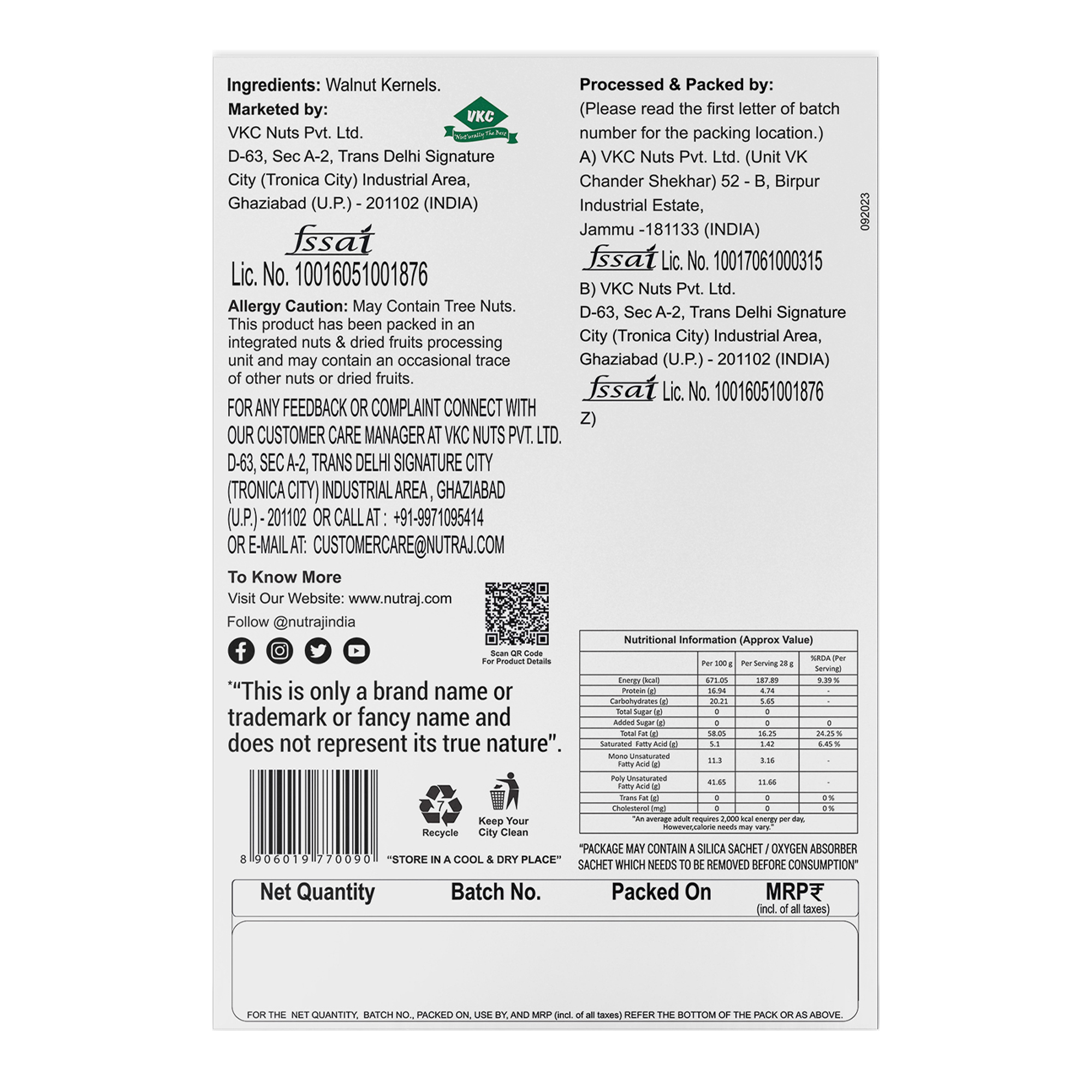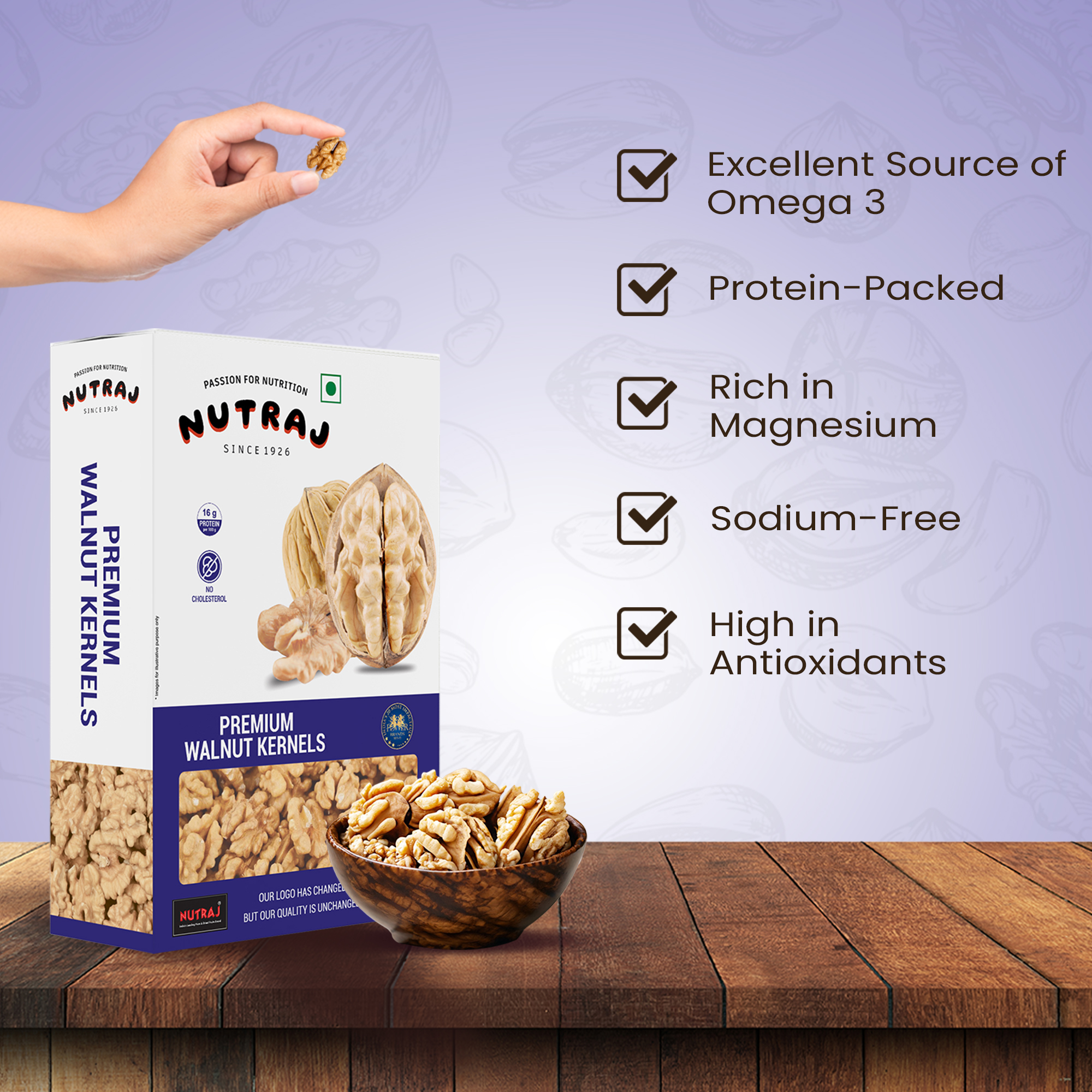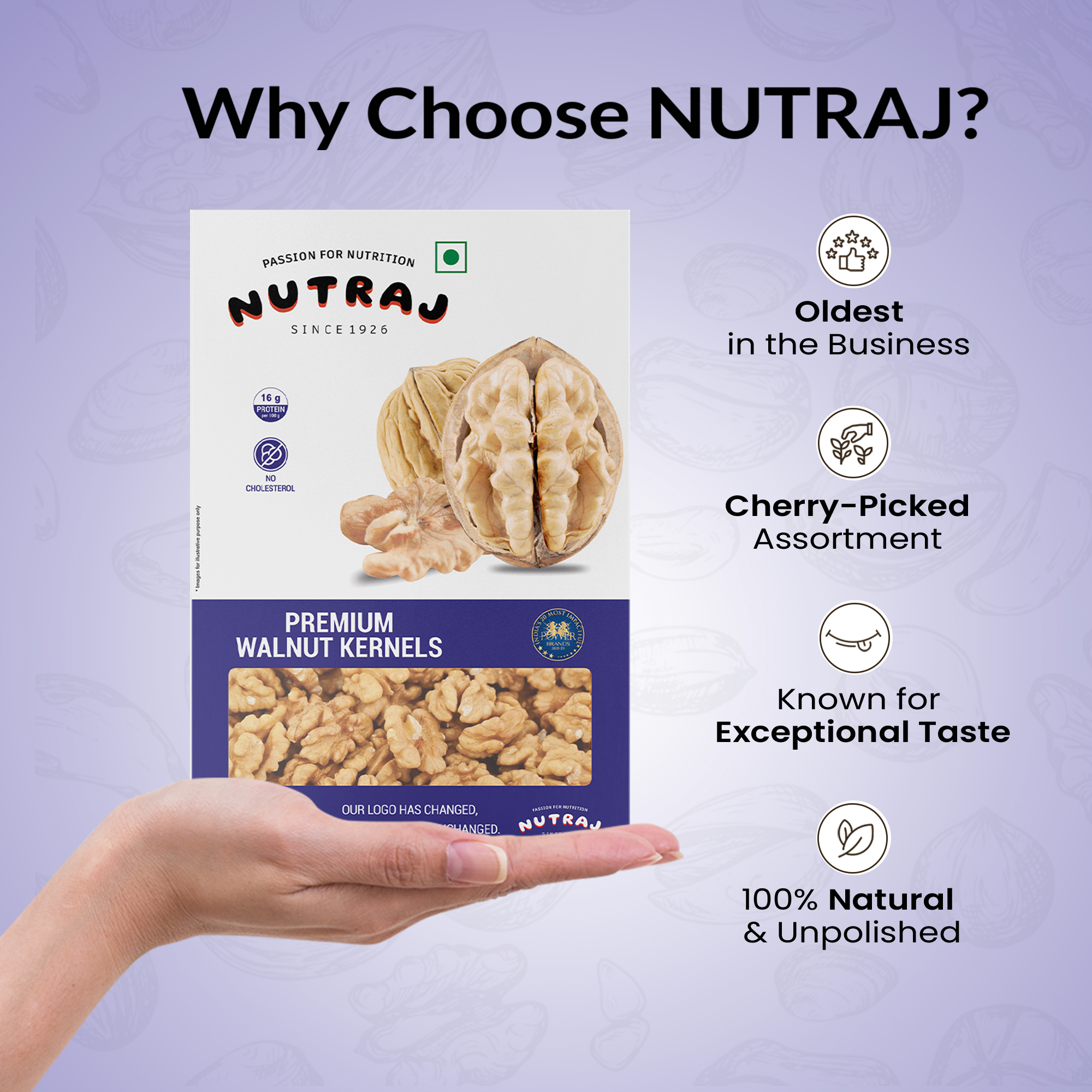 Nutraj brings to you a range of premium dry fruits.Walnuts are natural source of fibre, supports weight control.Handpicked, fresh, good sized, crunchy and wholesome raw akhort giri. walnut kernels come in a monocarton with vacuum-packed to retain freshness.