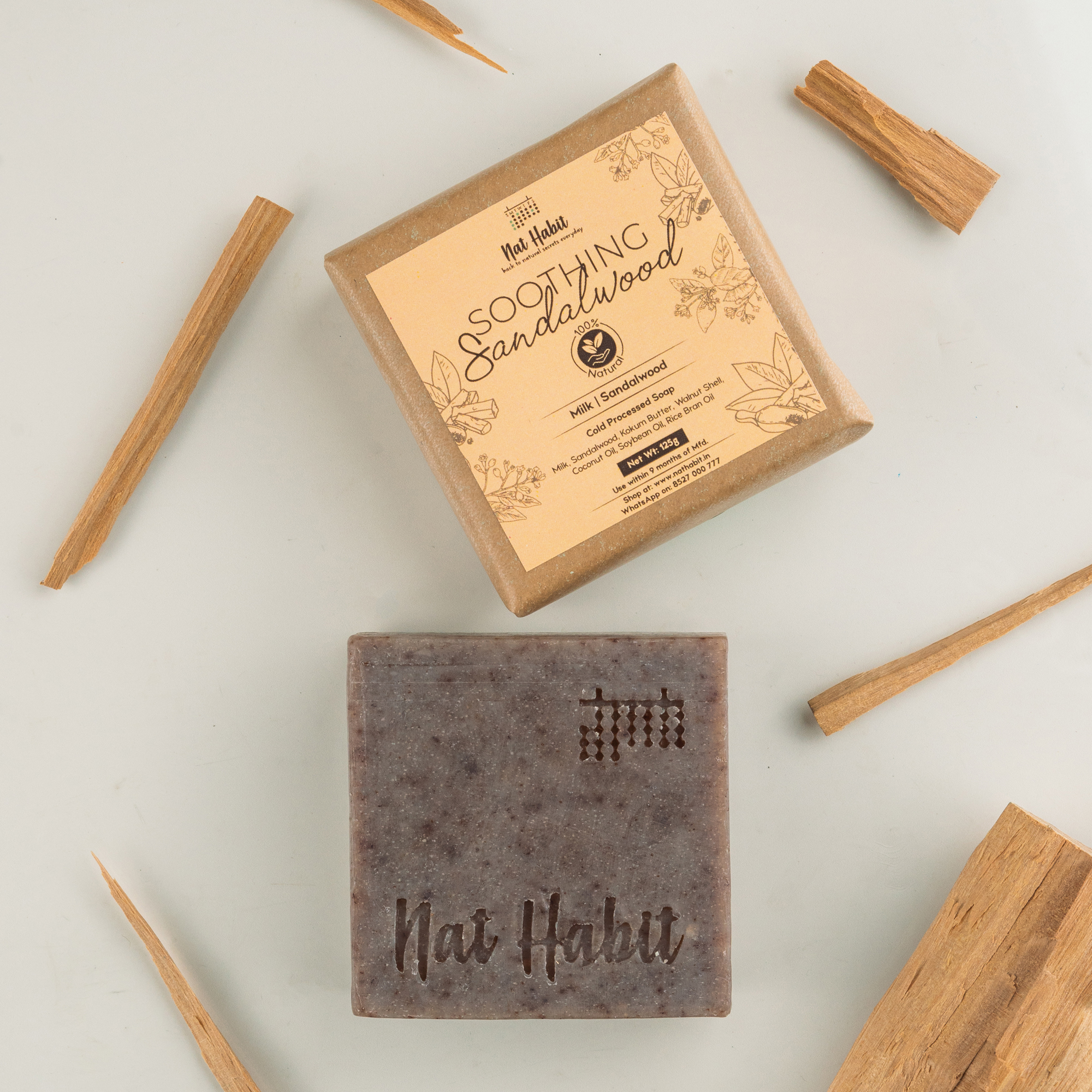 Nat Habit Soothing Sandalwood Handmade Butter Bath Soap is made using a natural and cold processed method. Suitable for men and women, this soap is made of pure oils, kokum butter, sandalwood and milk. The non-drying soft cleansing soap protects the skin's natural oils. It soothes sunburn and sun tan, brightens skin and clears dead cells. The soap softens dry skin and hard skin while soothing itchy skin. It targets pigmentation and blemishes.