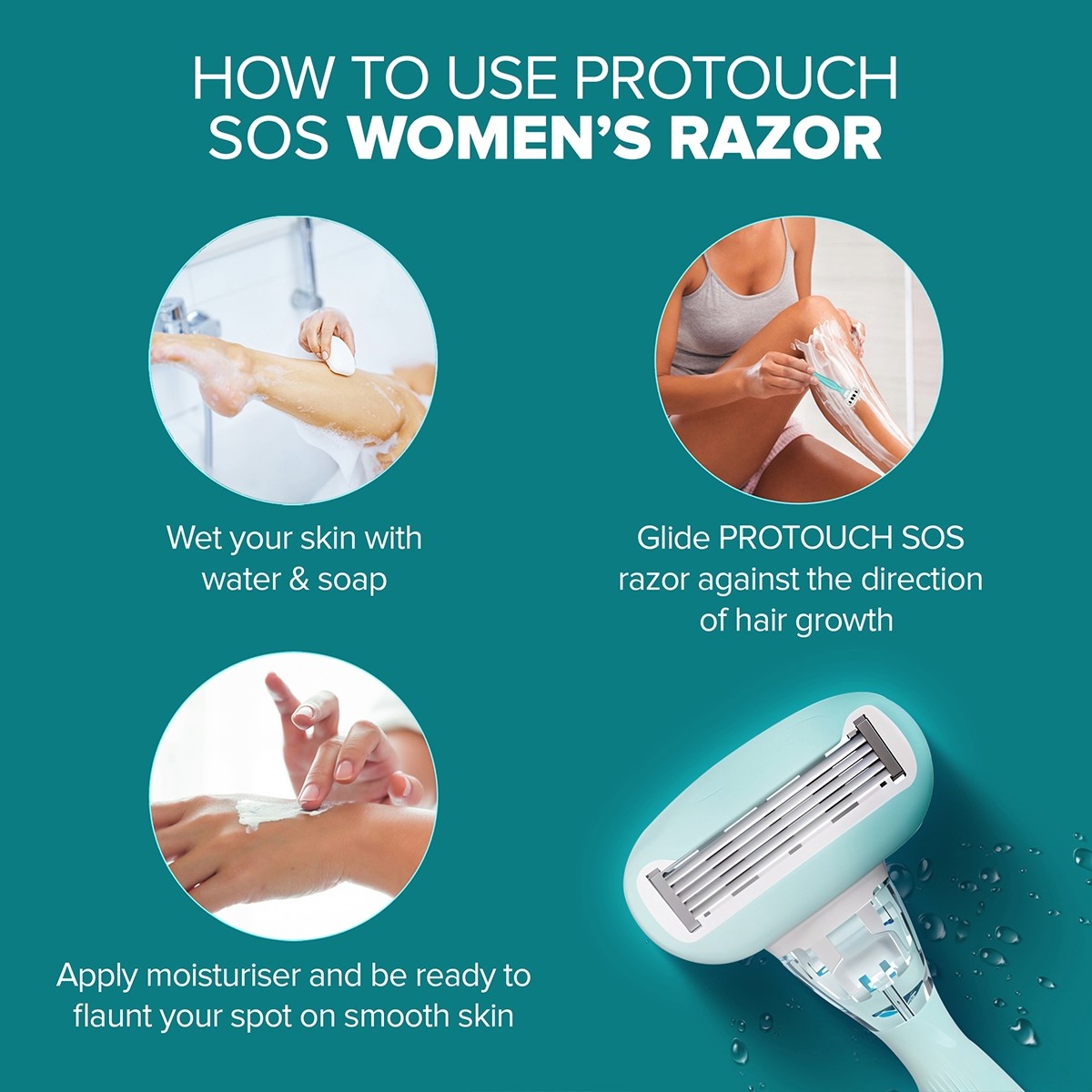 Say goodbye to last minute hair removal worries with PROTOUCH SOS Women's Razor. Designed with 5 precision blades, a rounded flexible head, and an ergonomic anti-slip handle, it glides effortlessly on every curve, making hair removal quick & effortless. Enriched with Avocado Oil & Aloevera Ext. It's wide moisturizing tips helps to protect & nourish skin, preventing dryness & irritation on sensitive skin. The cartridge is easily washable that extends blade life. The SOS Razor handle is compatible with refill cartridges so, No need to buy a new razor after every shave. Whether it's a big event, quick getaway, or unexpected outing, the SOS Razor ensures spot-on smoothness anytime you need it!