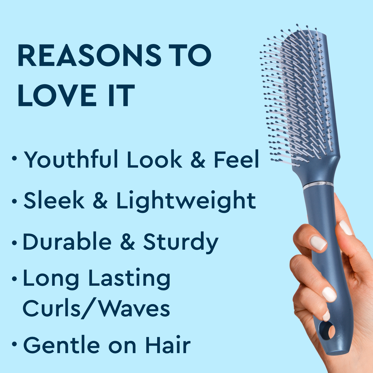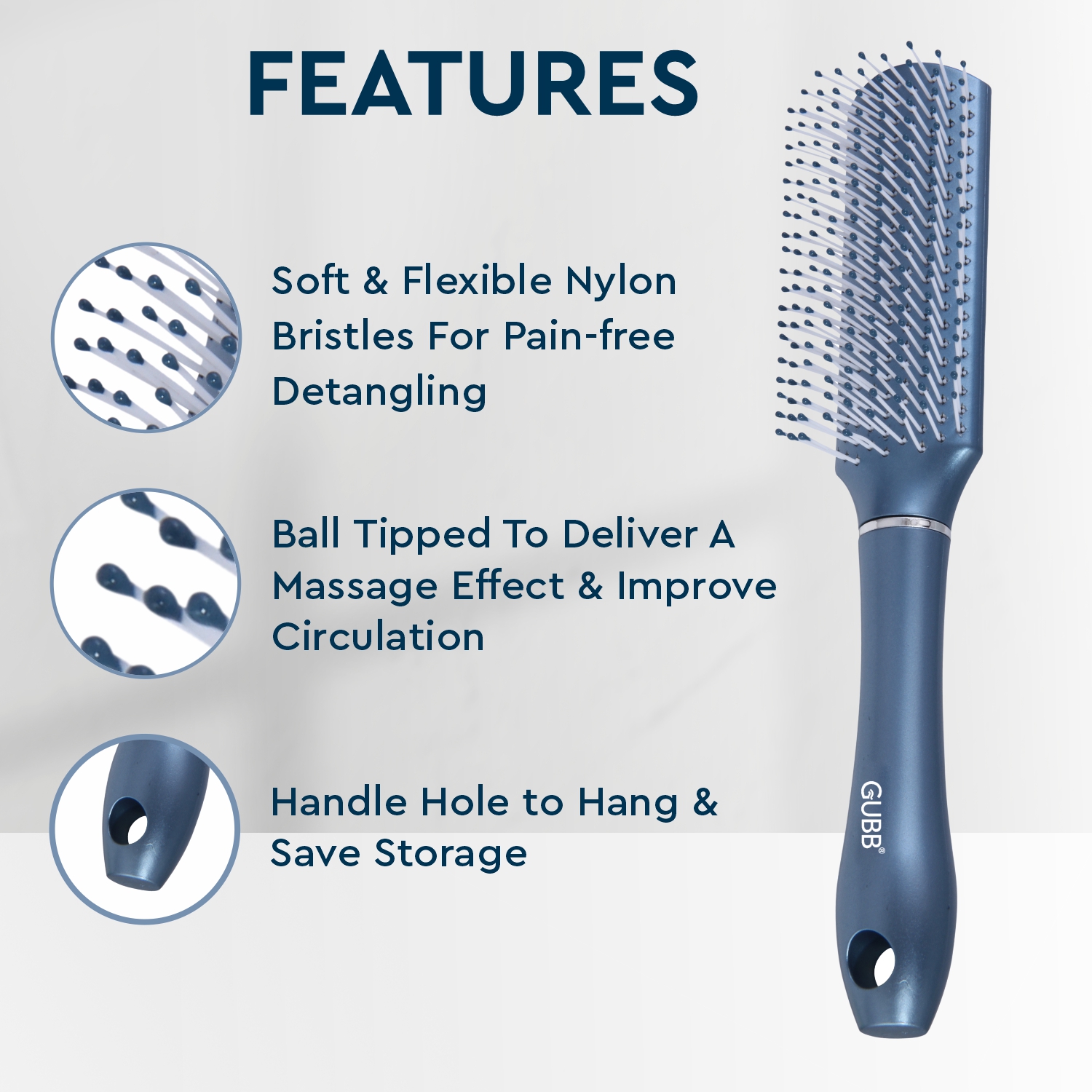 Style and groom your hair with this rectangular styling brush. The bristles are cushioned with soft, ballpoint capped tips that massage the scalp and help in pain-free detangling. The ergonomically designed plastic handle and lightweight body give you control while styling. Use this brush everyday for grooming, styling and detangling your hair.