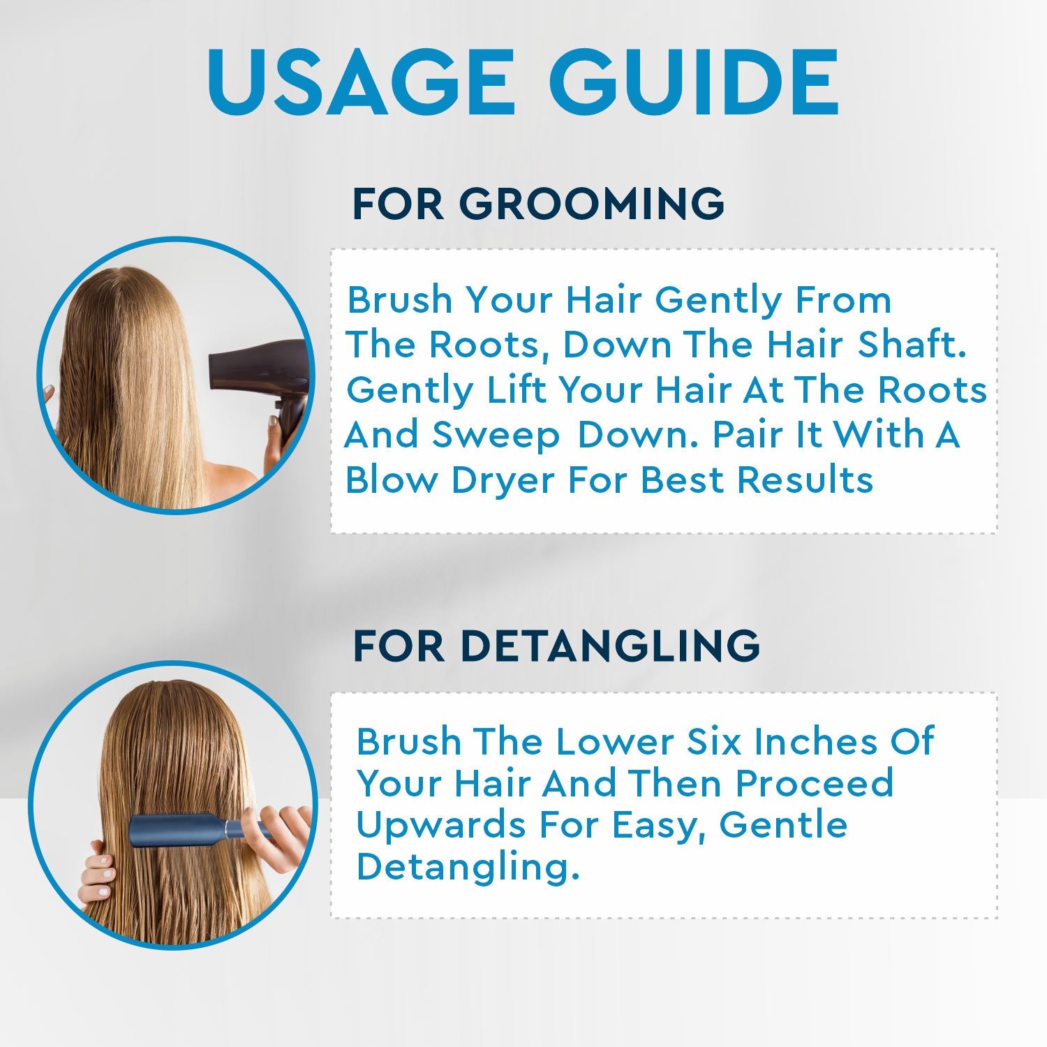 1. The brush is great for detangling and brushing through dry hair. Brush the lower six inches of your hair and then proceed upwards for easy, gentle detangling.